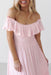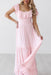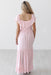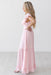 The Tiffany Dress captures the essence of a summer sunset with this ethereal blush pink maxi dress. The design features a beautifully smocked bodice for a tailored fit, complemented by a romantic ruffled neckline and fluttery short sleeves. Delicate lace trim accents the tiered skirt, which flows into a voluminous ruffle hem that adds graceful movement to the silhouette. Shown here with clear heels, this gown is a dreamy choice for a summer wedding or an upscale garden party.