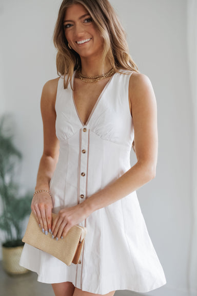 The Skylar Dress combines timeless elegance with contemporary flair in a crisp ivory hue. This structured mini features a flattering V-neck collar,...