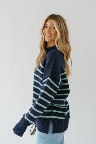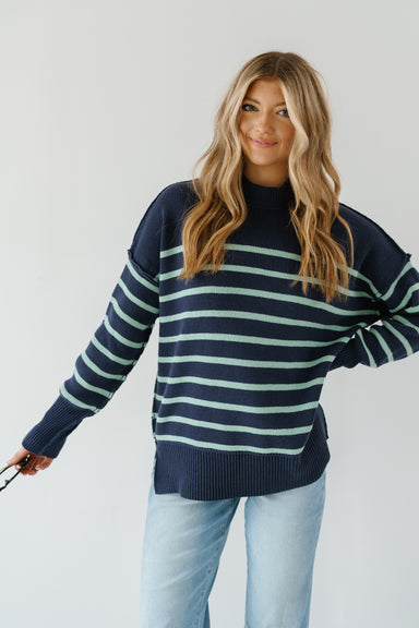 Add a touch of playful elegance to your basics with this deep navy crewneck sweatshirt. It features a charming, oversized pinstriped bow appliqué o...