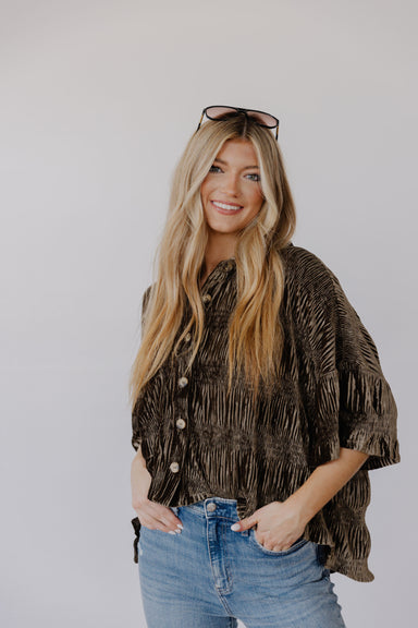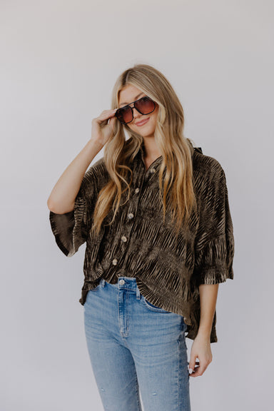 This olive green button-up top combines effortless comfort with relaxed sophistication! Crafted from a soft, lightweight crinkled fabric, it drape...