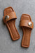 These Colette Sandals are the definition of effortless luxury, featuring a smooth faux-leather finish and a standout gold-tone medallion on the single wide strap. The sleek, square-toe design and flat, cushioned footbed make them a comfortable yet high-end choice for elevating your everyday basics.