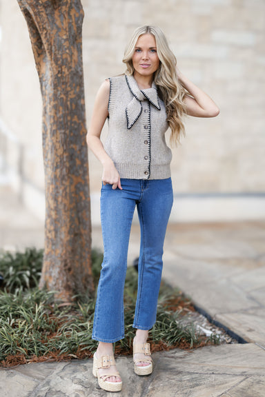 This sweater vest is featuring a cozy oatmeal-colored knit and a unique statement collar that adds instant structure to your look. This button-up ...