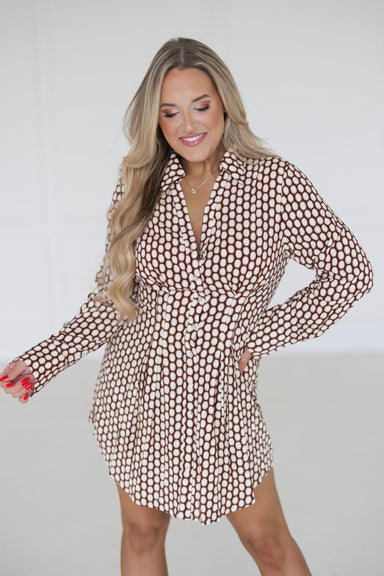 Prepare to charm in the "Shay Mini Dress!" Perfect for any fall occasion, this dress is great for making a statement! Complete with an ivory and br...