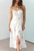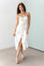 The Addison Dress features a delicate tan floral print, offering a sophisticated and romantic aesthetic for warm-weather occasions. It is designed with slender adjustable spaghetti straps, a ruched sweetheart neckline, and a flattering button-down front that creates a polished, feminine silhouette. The airy, flowy skirt and subtle front slit provide effortless movement.