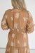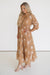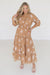 Introducing the “Jolene Dress!” This long midi dress exudes rustic charm with its milkmaid-inspired top and puff sleeves that extend past the elbows, creating a romantic cottage feel. The top, with two buttons, is accentuated by an elastic waistband that defines the waist and flows into the skirt, which is subtly divided by trimming in three sections. The mocha-colored fabric is beautifully embroidered with delicate flowers, enhancing the dress's natural, feminine vibe!