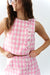 The Worth it all top & skort set offers a playful and retro-inspired look, featuring a sleeveless cropped top and a coordinating mini skirt. Both pieces are detailed with a charming scalloped edge along the button-front closures, adding a feminine and unique touch to the classic checkered pattern. The set’s structured yet airy silhouette makes it a perfect choice for sunny daytime outings.