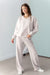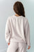 The Keep the vision top features a relaxed, slightly oversized fit with dropped shoulders and long sleeves finished with ribbed cuffs. It is designed with a deep V-neckline that is accented by a clean, white contrast trim. The smooth, mid-weight fabric provides a polished yet comfortable look, especially when worn as a coordinated set with matching wide-leg trousers.