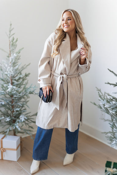 This soft taupe wrap trench coat is the definition of elevated winter layering. With it's oversized lapels and cinched waist tie, it instantly give...