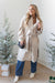 This soft taupe wrap trench coat is the definition of elevated winter layering. With it's oversized lapels and cinched waist tie, it instantly gives that “luxury without trying too hard” vibe. The relaxed sleeves and longline silhouette make it both warm and effortlessly stylish—perfect for dressing up denim or throwing over your holiday outfits. This is the coat that makes every snowy-day coffee run feel a little more glamorous.