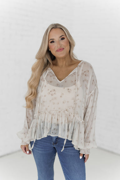 Feel confident in the "Take The Reins Top!" This elevated blouse is a true feminine staple for the fall! It features a light ivory base with delica...