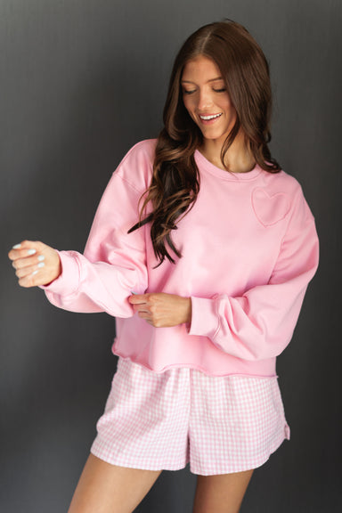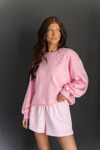 Add a little love to your lounge rotation with this dreamy pastel pink sweatshirt featuring delicate heart-shaped appliqués on the chest. The rela...