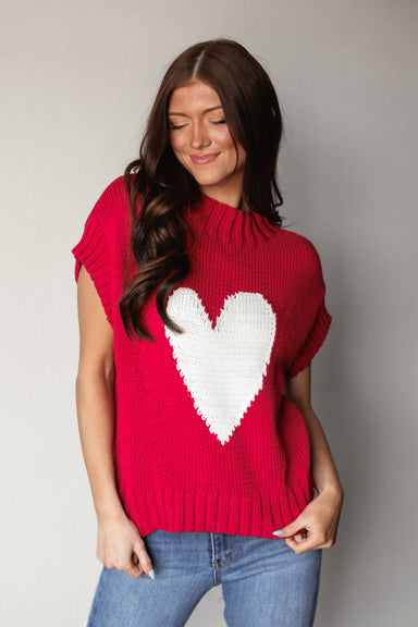 Wear your heart front and center with this bold red sleeveless knit. Featuring a large white heart intarsia design on the chest, this piece combin...