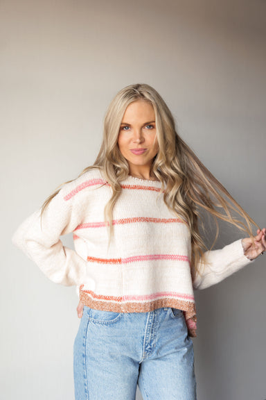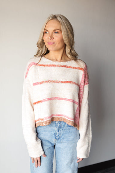 Forget the rulebook—this sweater proves that horizontal stripes are a match made in knitwear heaven. Its asymmetrical pink sleeve and warm, sunset...