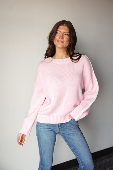 Sweeten up your essentials with this soft pink ribbed sweater that’s as light and airy as a confection. Featuring a crisp white crewneck and match...