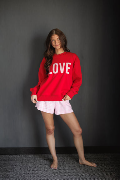 Make a bold statement with this vibrant red crewneck featuring a massive, pinstriped "LOVE" appliqué across the chest. The ribbed collar, cuffs, a...