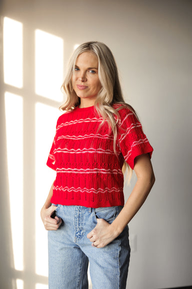 Turn up the heat with this red knit sweater that’s practically bursting with texture and charm. Its delicate open stitch design and wavy white acce...