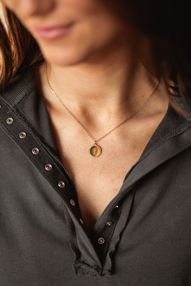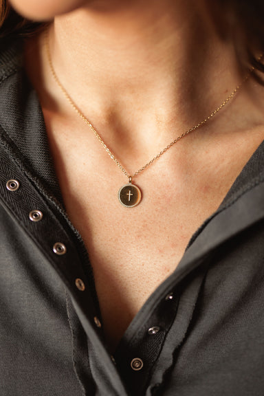 Give your everyday look a meaningful anchor with this elegant gold necklace featuring a classic cross centered on a textured coin. The dainty chain...