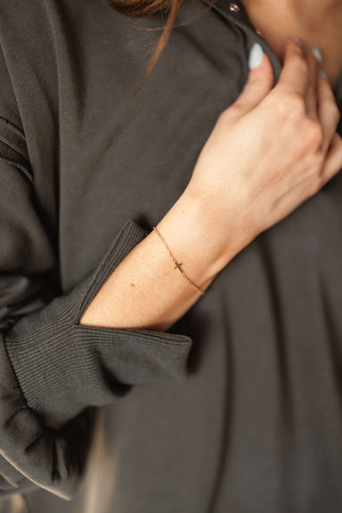 Give your jewelry stack a fresh perspective with this dainty gold bracelet. Featuring a minimalist, horizontally-set cross, it’s a modern and chic ...