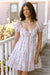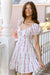 The Nicole Mini Dress embraces a romantic, countryside aesthetic with this delightful white mini dress, featuring a dainty vertical pink floral and vine print. The design is characterized by a sweetheart neckline with a functional tie detail and classic puffed short sleeves that enhance its feminine silhouette. The fitted bodice transitions into a playful, tiered ruffle skirt that adds youthful movement to the piece. Styled here with crisp white Western boots, it serves as the perfect look for a summer garden party or a sun-filled day on the ranch.