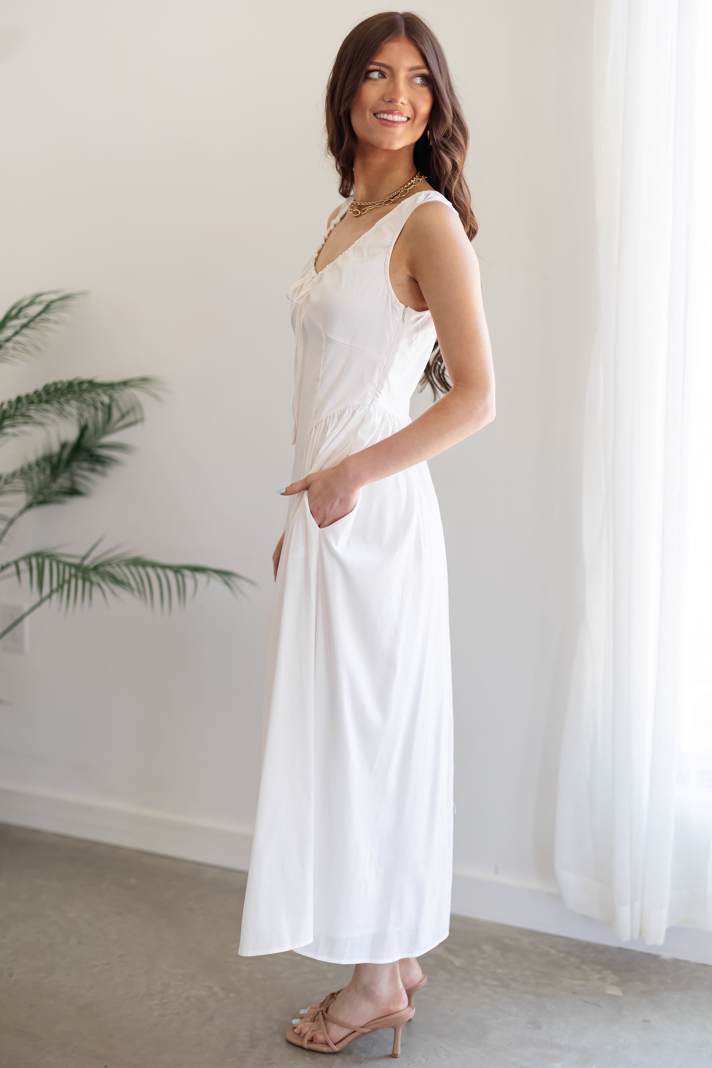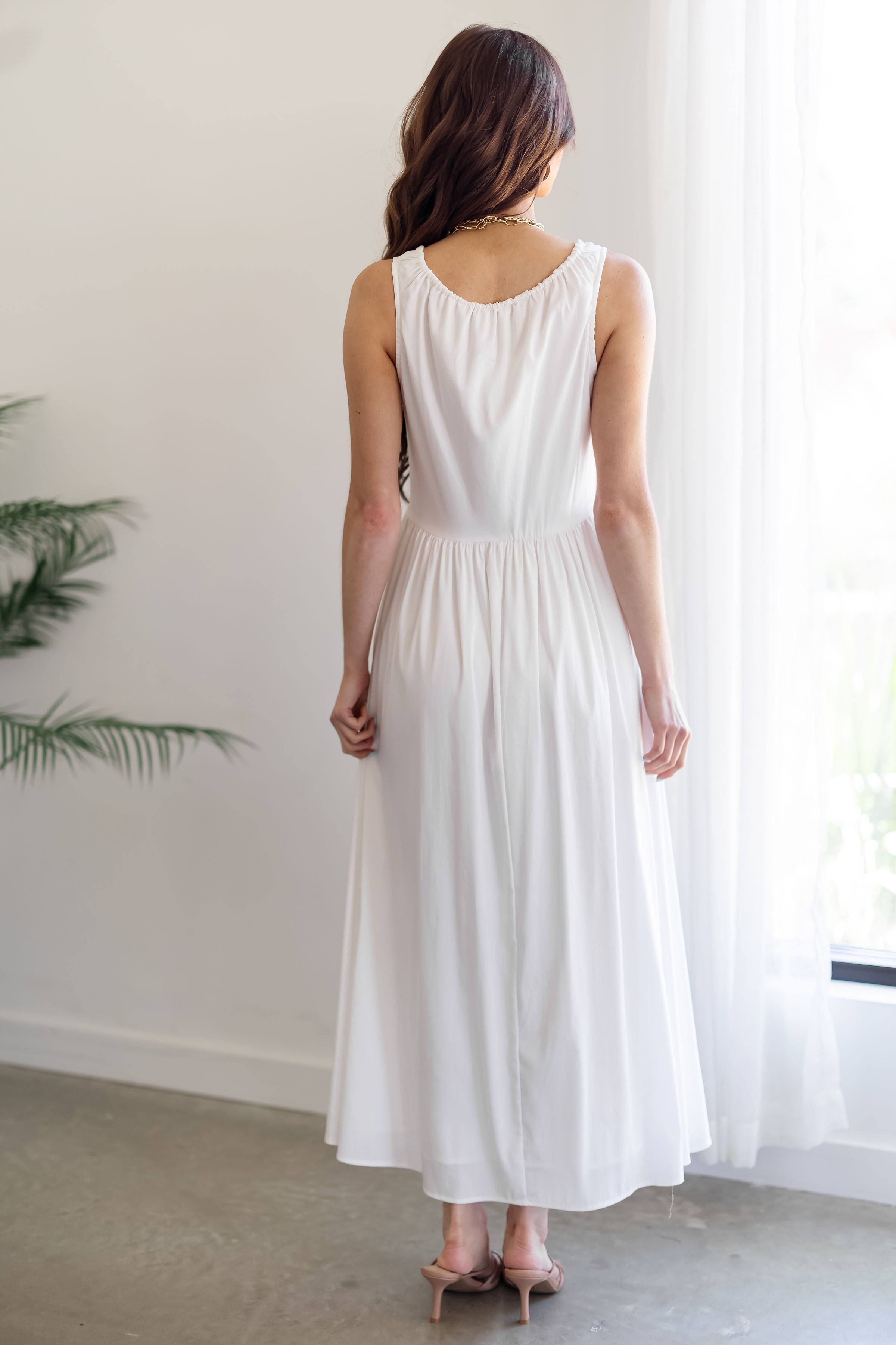 Embrace simplicity in the "Ava Dress!" The timeless and feminine vibes of this dress make it a true summer staple that you will turn to again and again! Complete with a drawstring neckline, basque waist, and flowy skirt, this dress is perfect for any occasion! Style it up with heels or pair with sandals for a more causal look!
