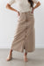 This soft washed tan denim skirt features a classic button-front look and functional side pockets for everyday practicality. The subtle A-line fit offers a flattering, versatile cut that transitions effortlessly from casual to polished styling.