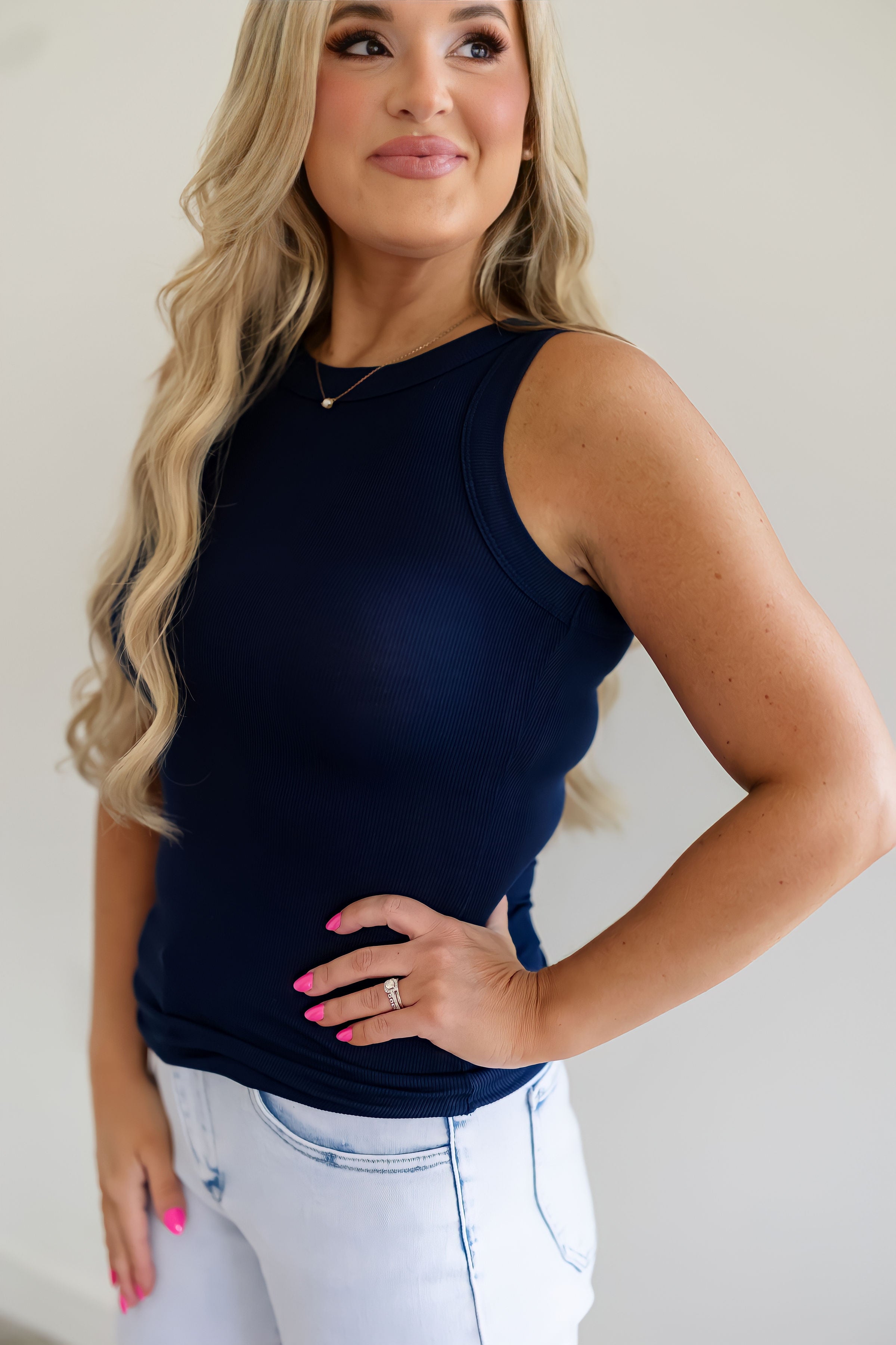 Go back to the basics with the "Clear Vision Top" in navy! This top is such a perfect staple piece for adding to your summer wardrobe. Perfect for layering or wearing solo, this tank features a full length, high neckline, and the perfect stretchy and soft material. Ideal for everyday styling with any bottoms!