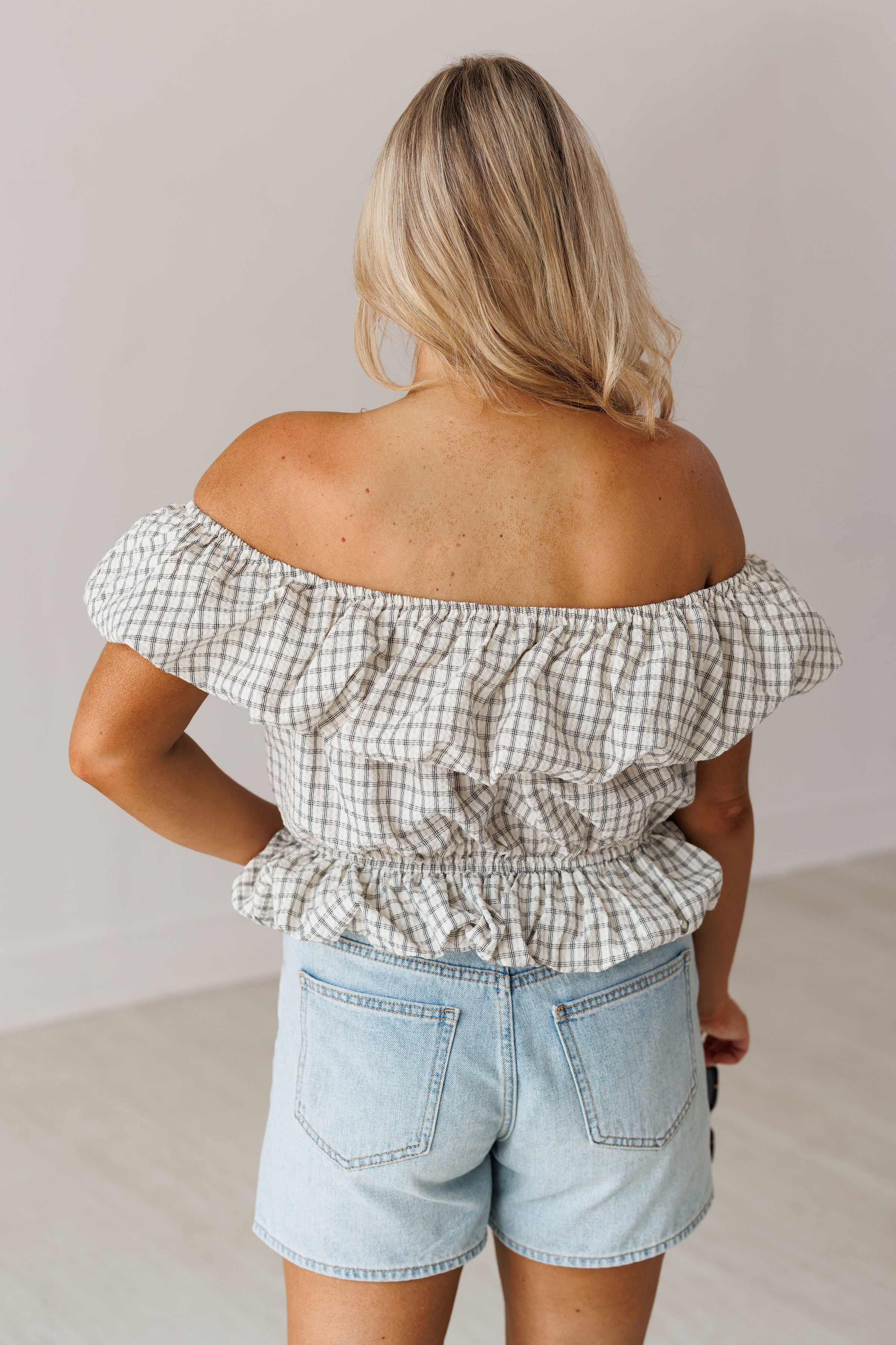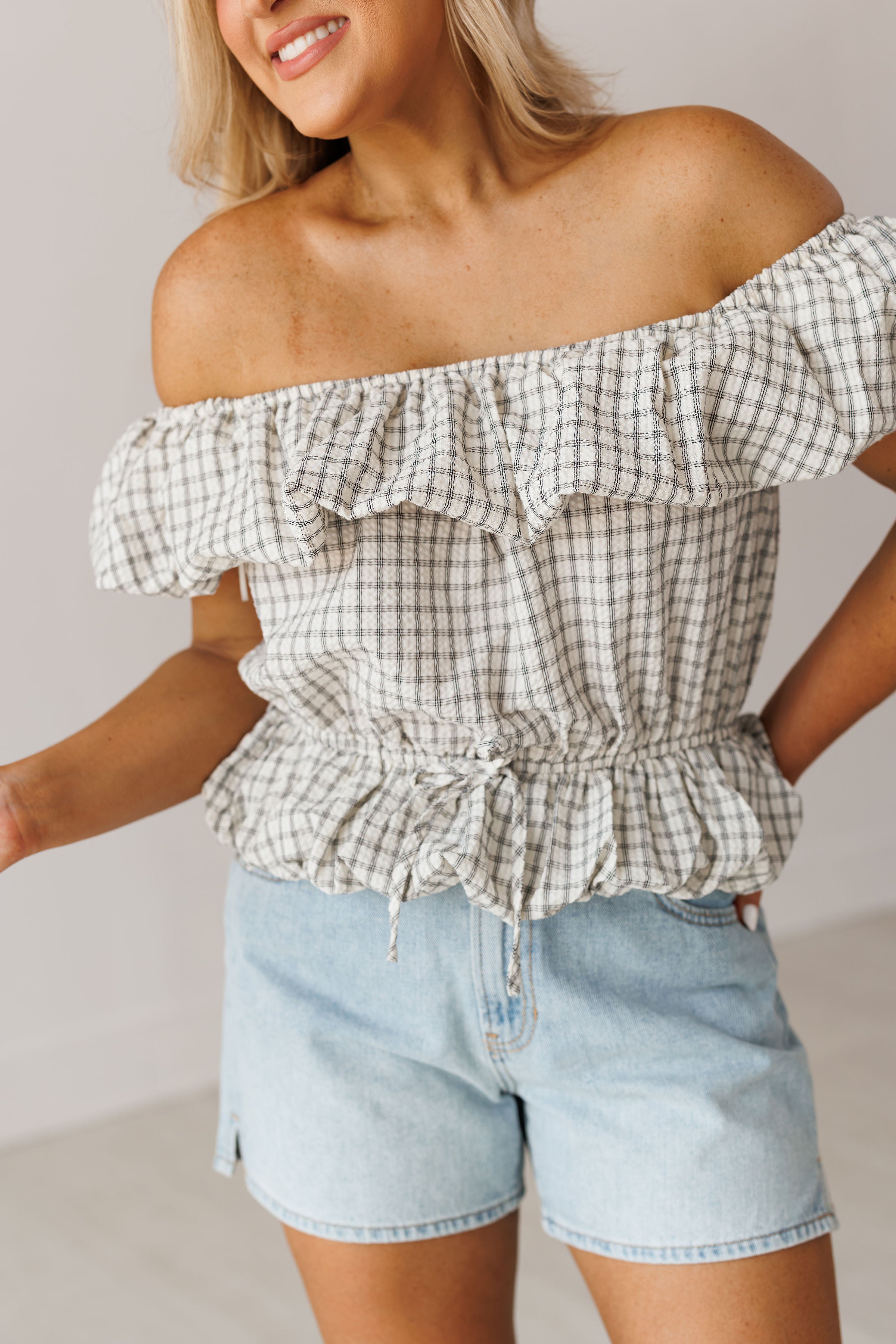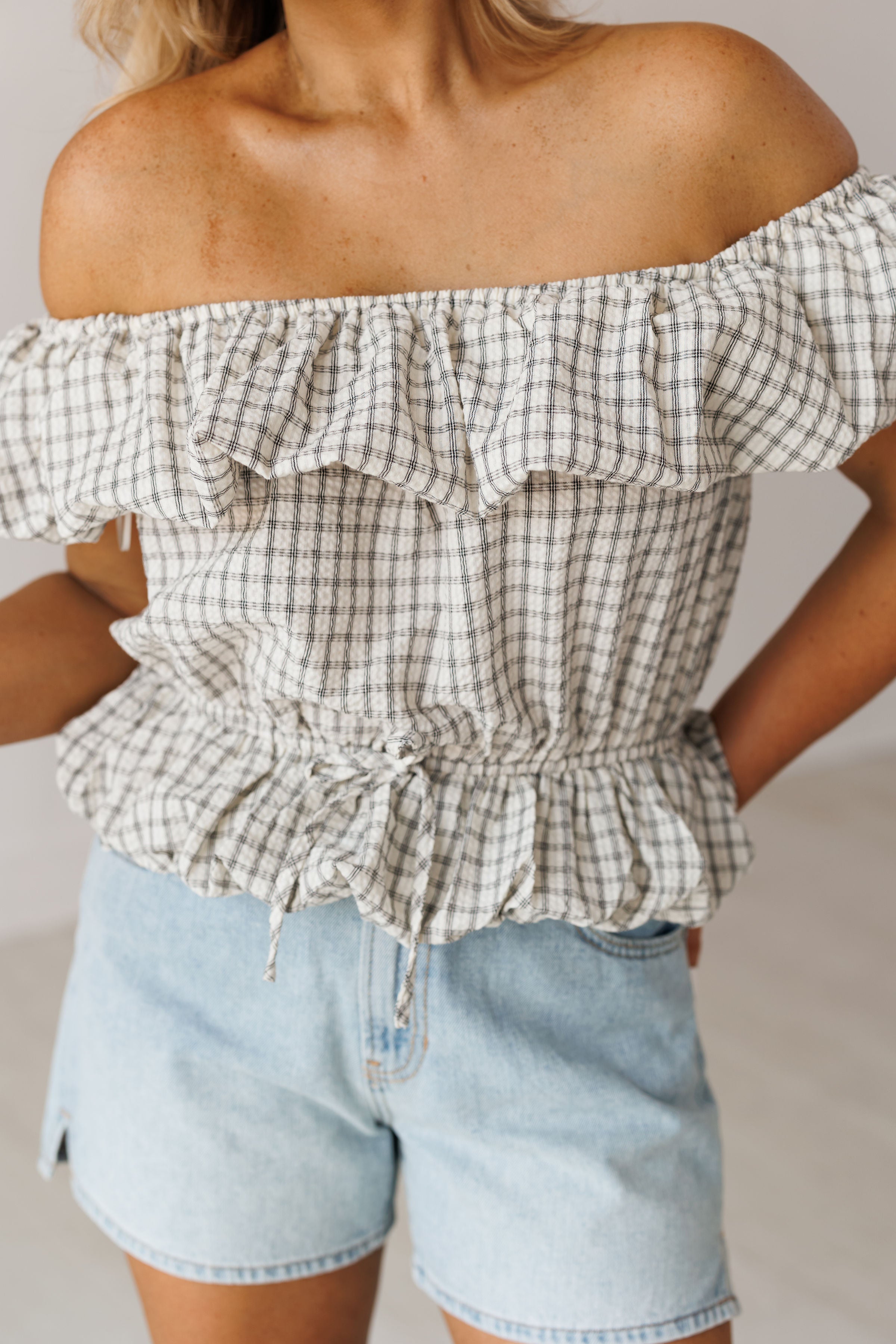 Prepare to turn heads in the "Coastal Air Top!" Effortlessly chic and elevated, this off the shoulder top is sure to make you look and feel your best! It features a checkered print, elastic ruffled neckline, and bubble hem on the bottom. Pair with denim shorts for an elevated and flirty look!