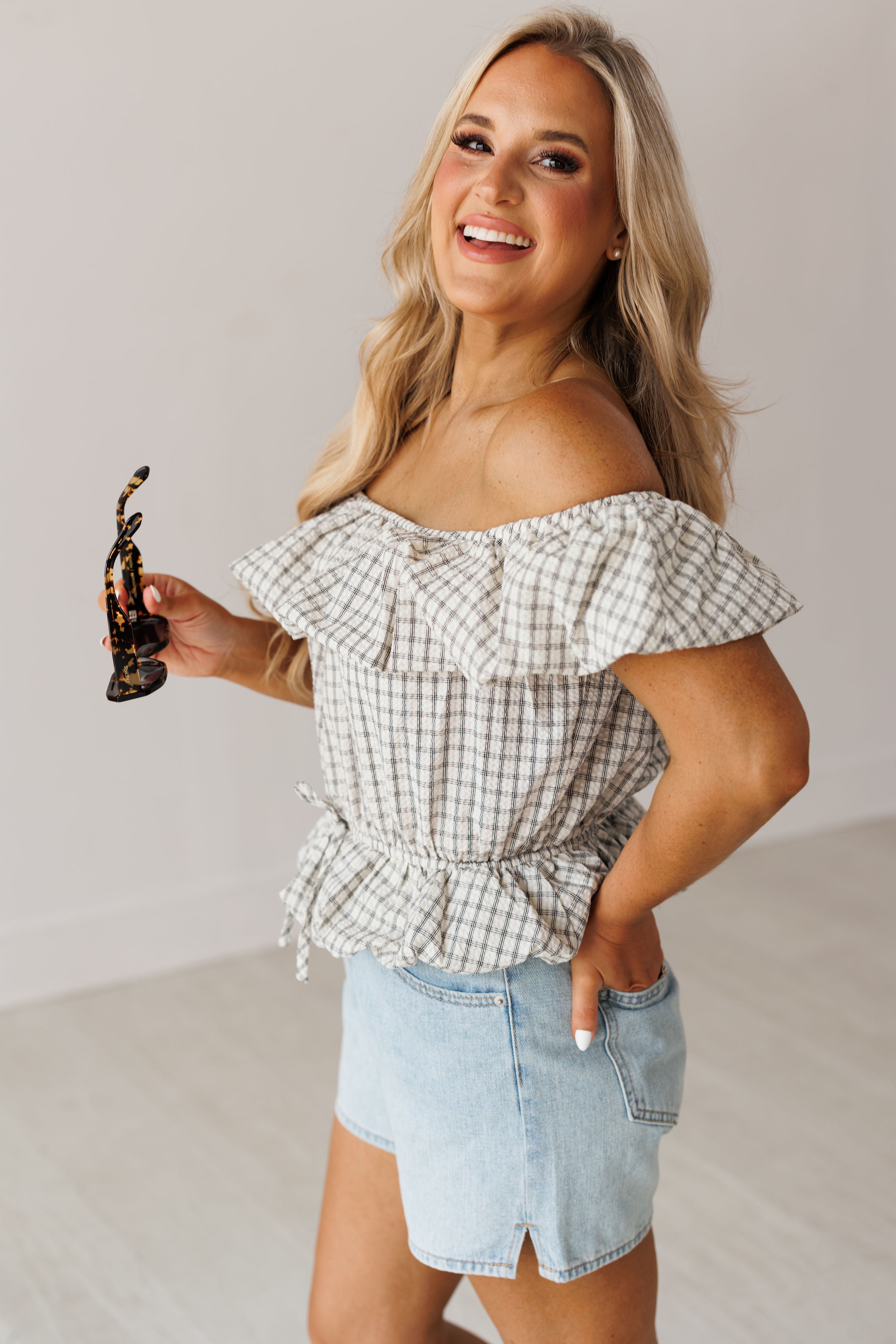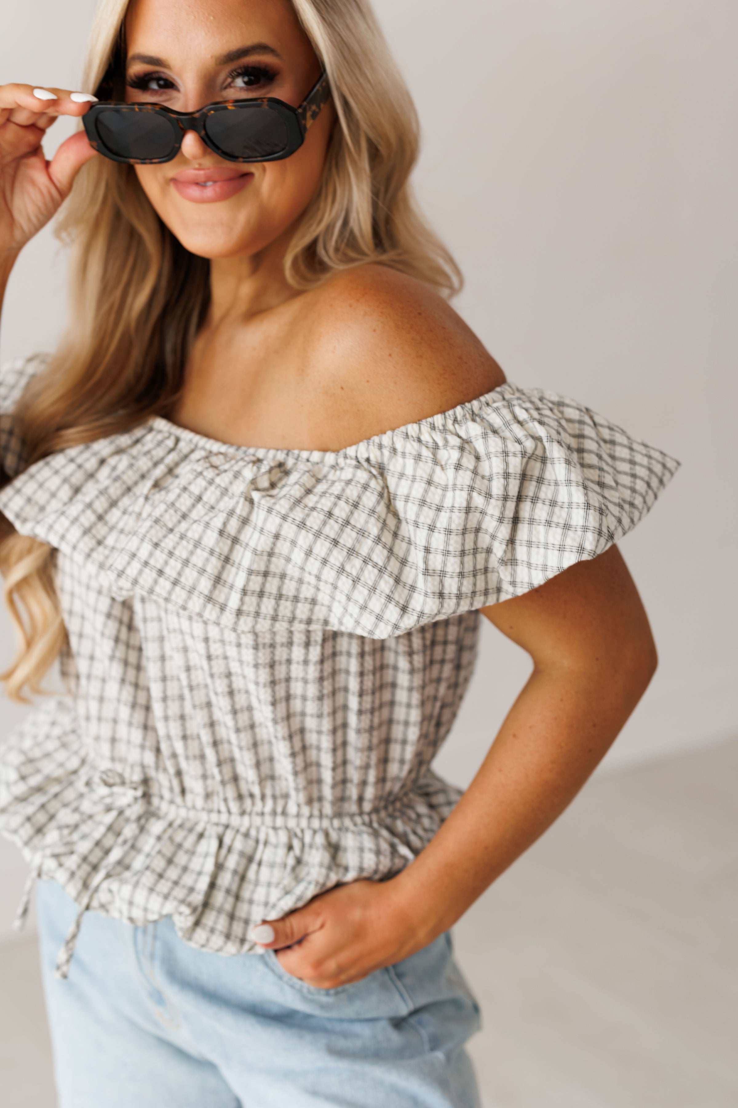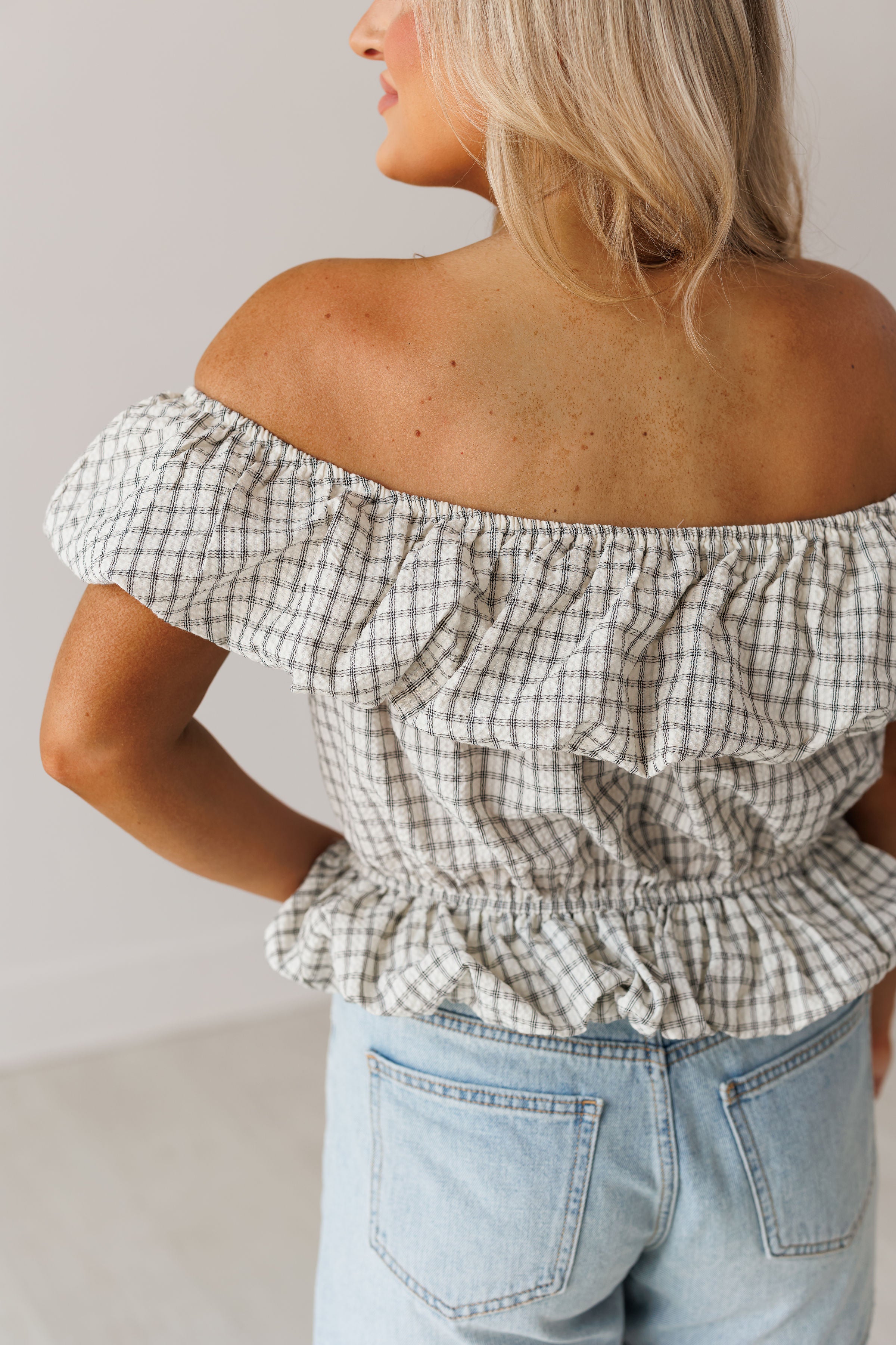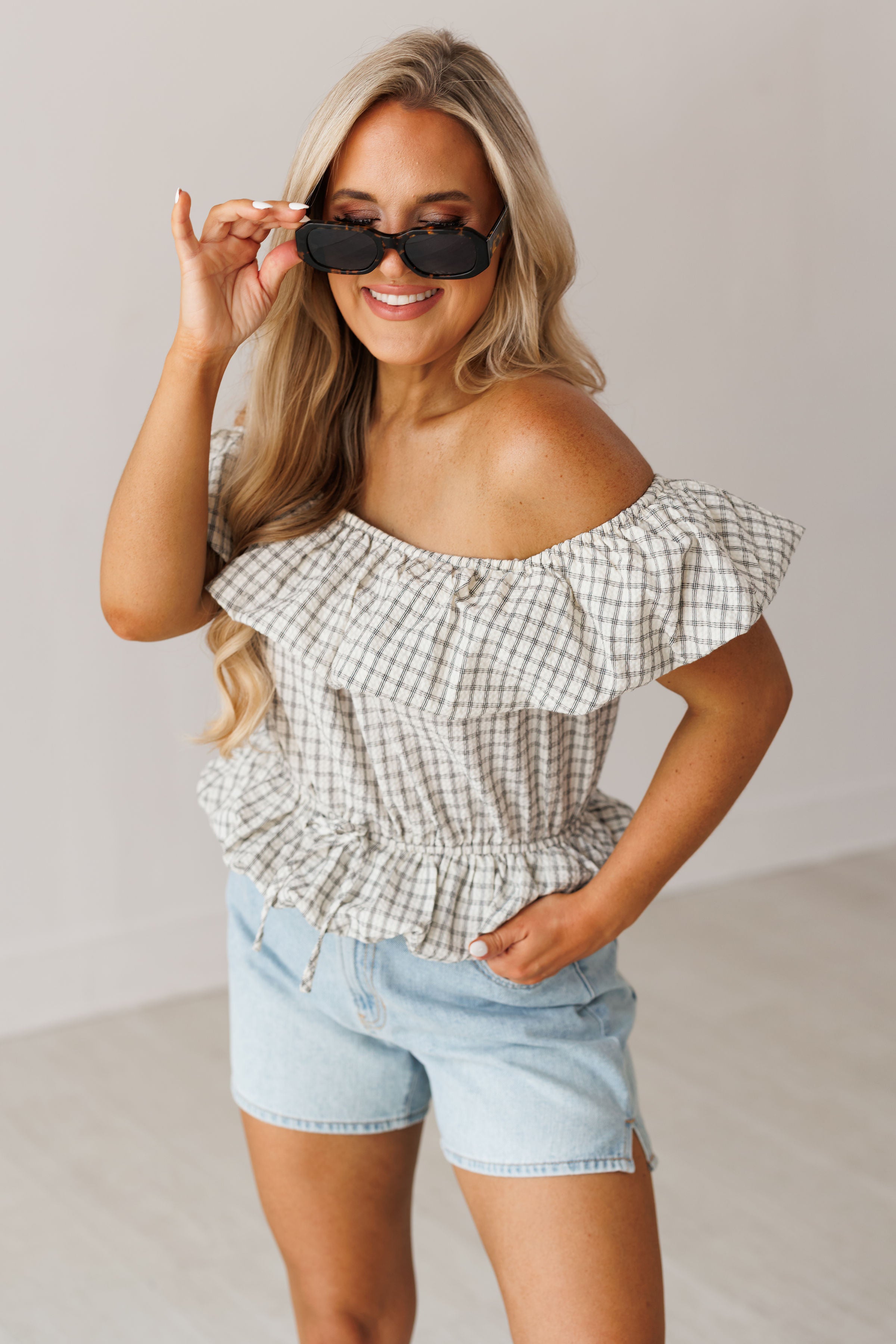 Prepare to turn heads in the "Coastal Air Top!" Effortlessly chic and elevated, this off the shoulder top is sure to make you look and feel your best! It features a checkered print, elastic ruffled neckline, and bubble hem on the bottom. Pair with denim shorts for an elevated and flirty look!