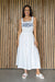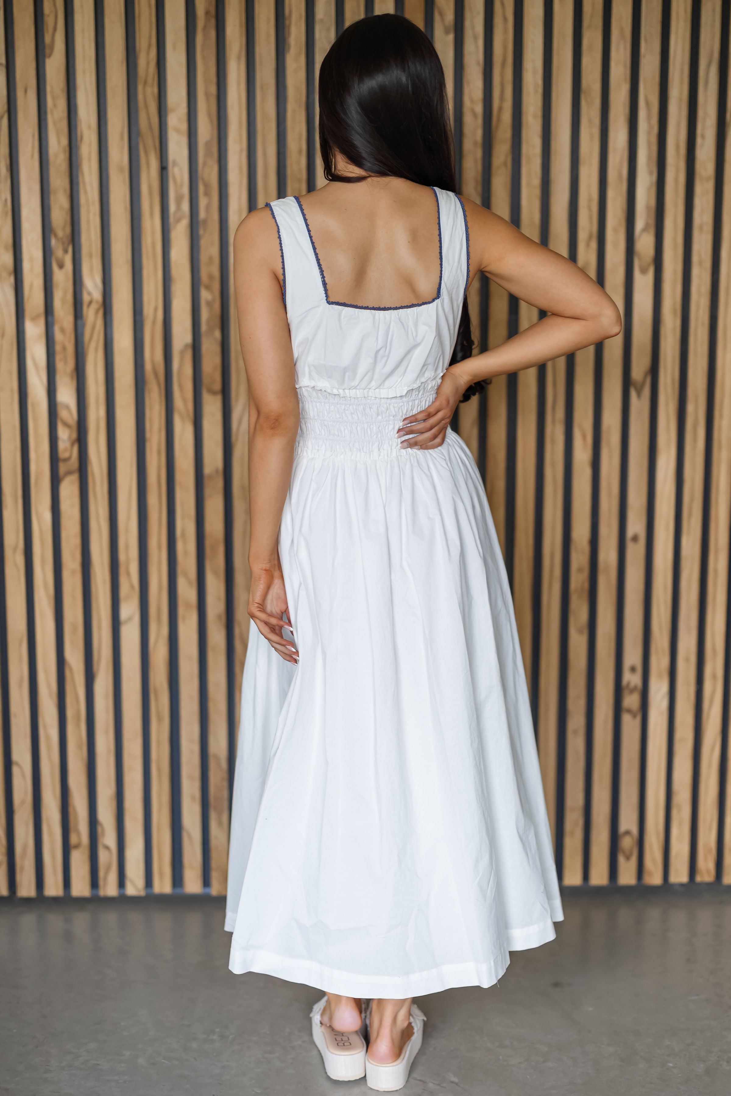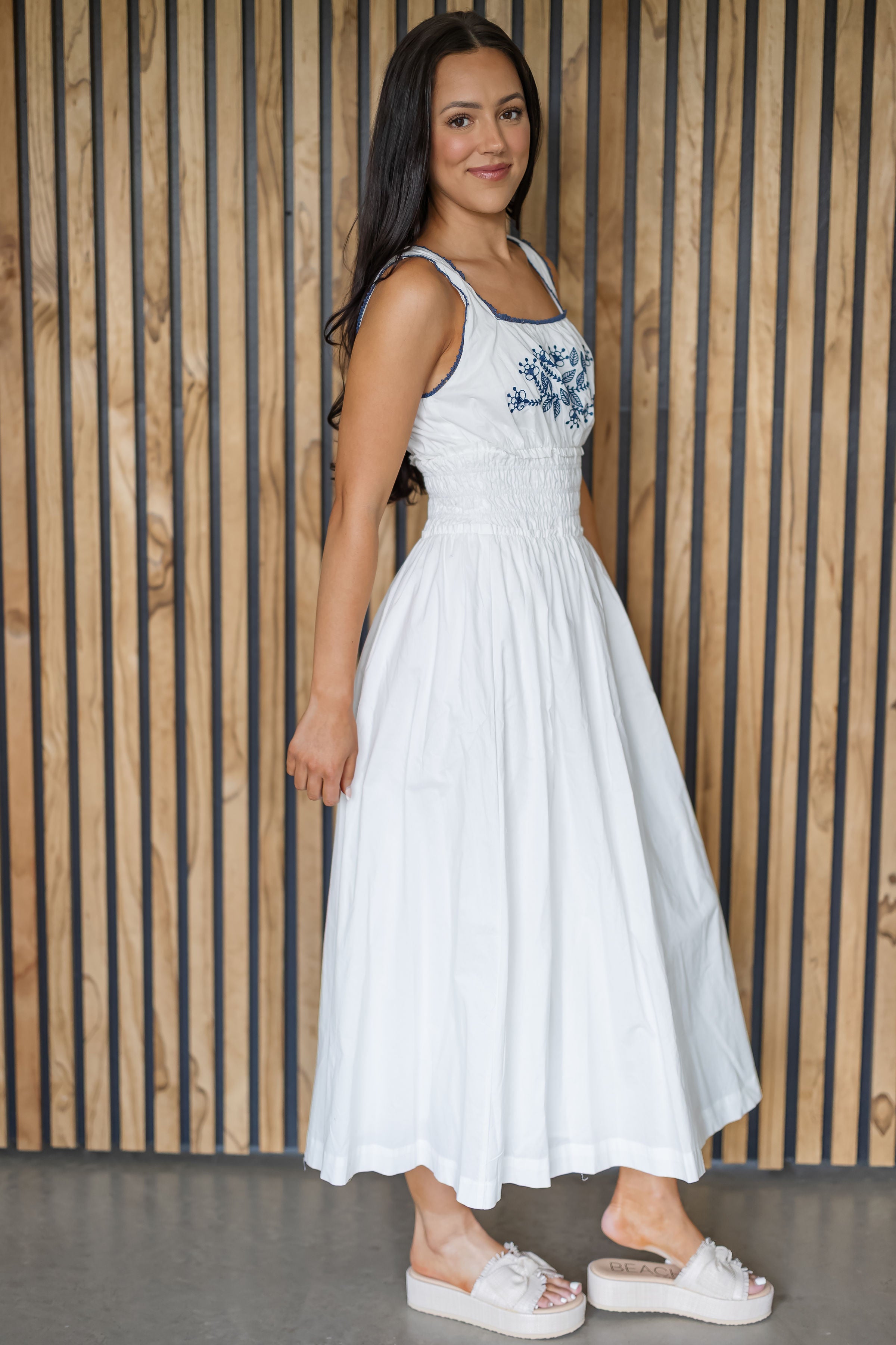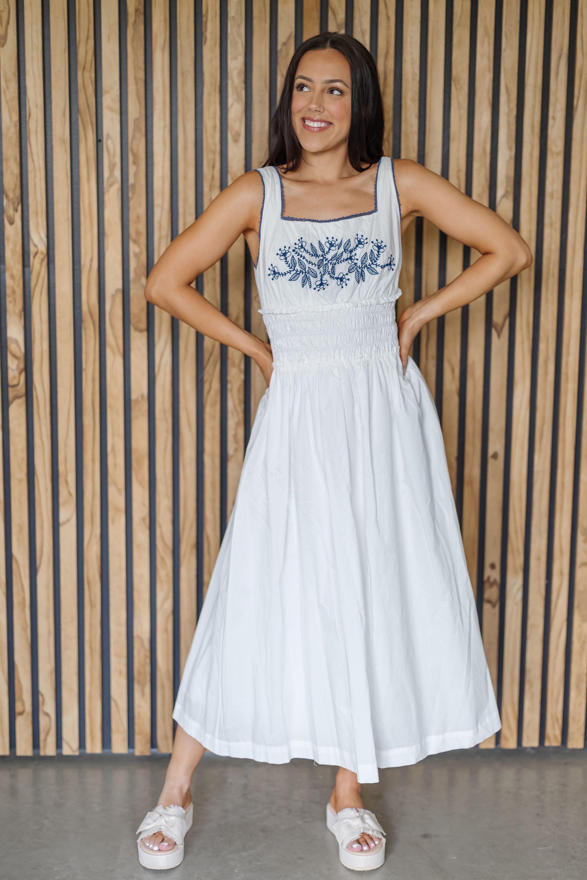Stay effortlessly charming in the "Julie Dress!" This midi dress is the perfect way to make an elevated statement this summer! Boasting a white base with floral embellishments along with an elastic bodice for added comfort and a flattering look. The dainty scoop neckline is both modest and timeless for church or date night!