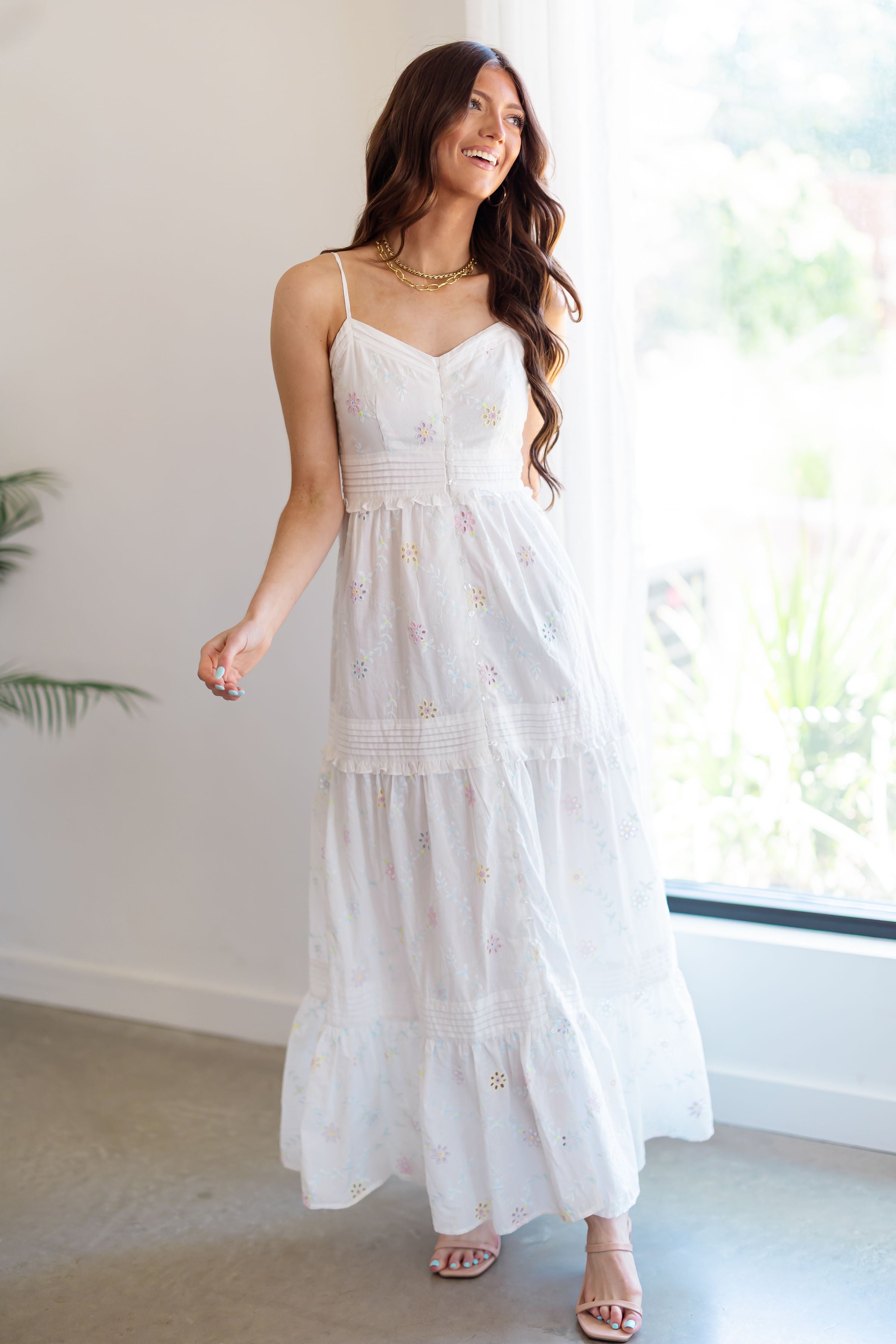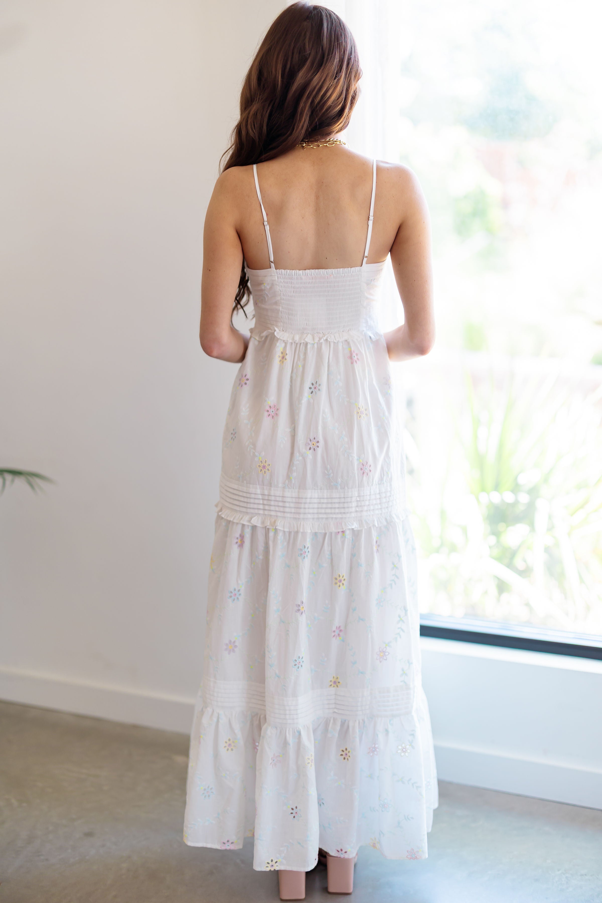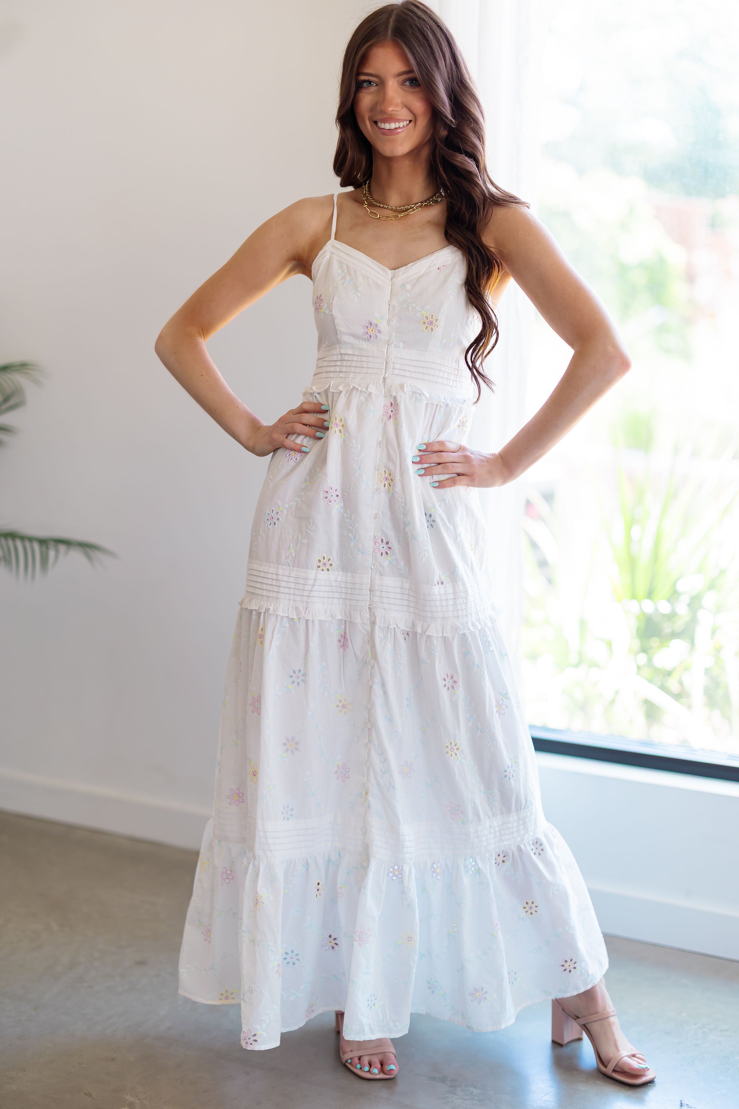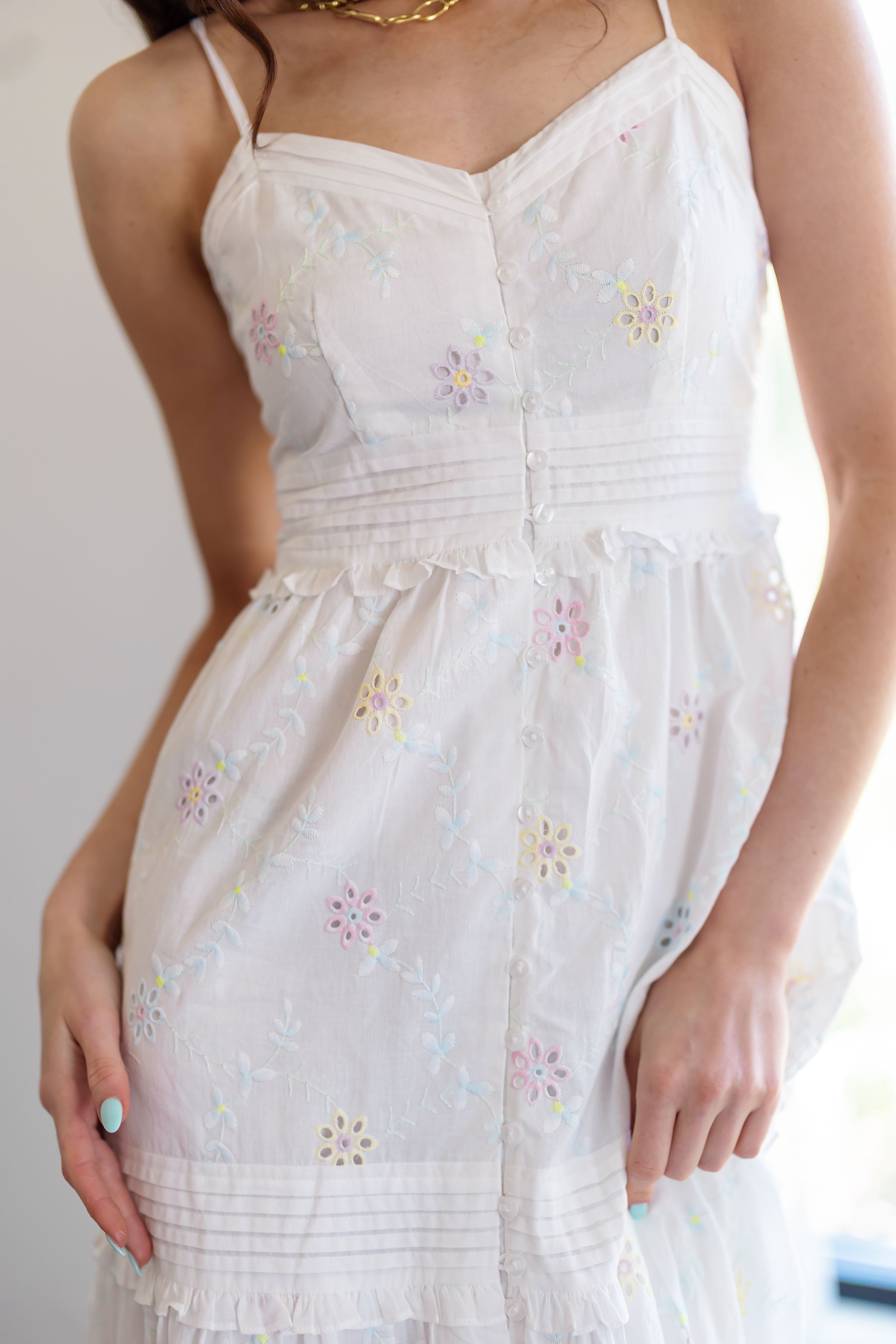 Prepare to charm in the "Kaylee Dress!" We can't get enough of the chic summer vibes in this dress! With so many charming details to love, this dress is sure to be your new go to! Complete with a white base that is accented by embroidered pastel florals throughout, along with a v-neckline and buttons down the front. The back is smocked, offering a comfortable fit for your next date night out!