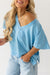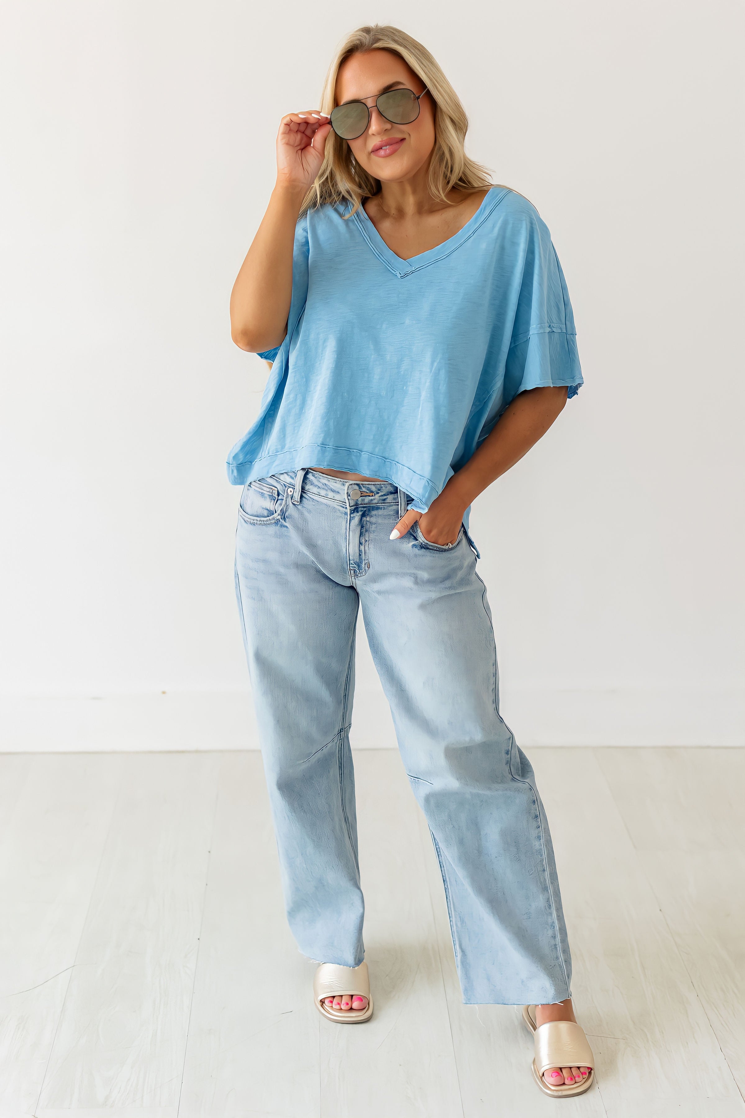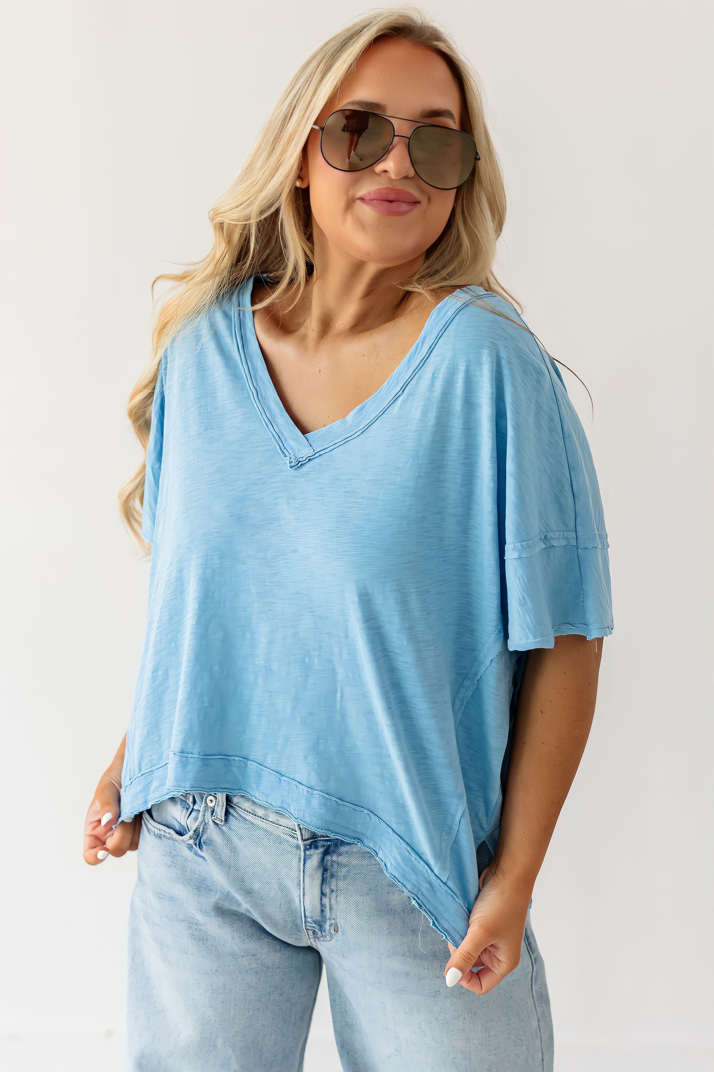 Meet the new "Keep Going Forward Top" in blue! If you are in need of a casual top for everyday wear this summer, this top is for you! Boasting a relaxed fit with a wide v-neckline, simple blue color, and distressed hemlines. This top would be an easy option for wearing with any denim shorts, leggings, or athletic shorts!