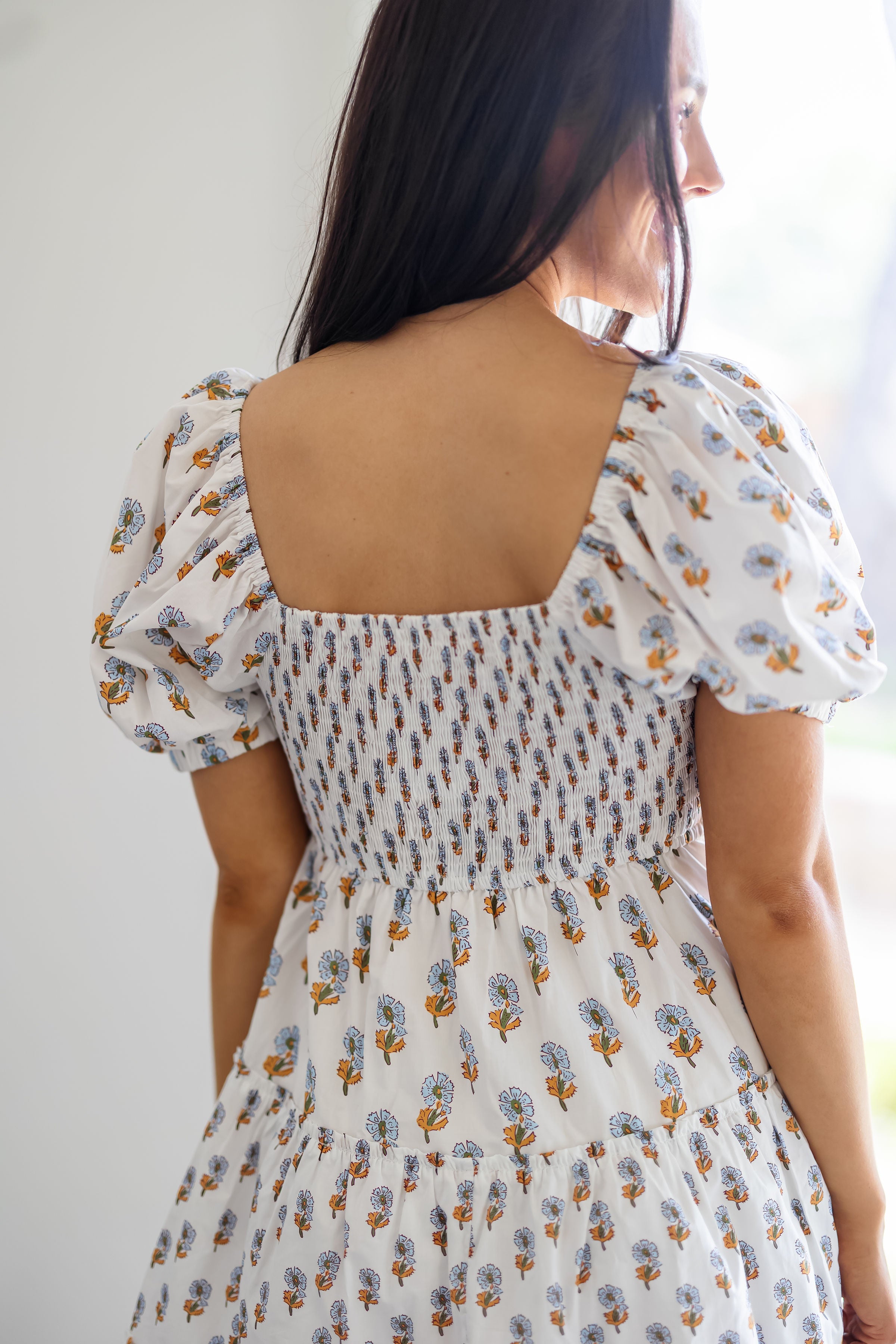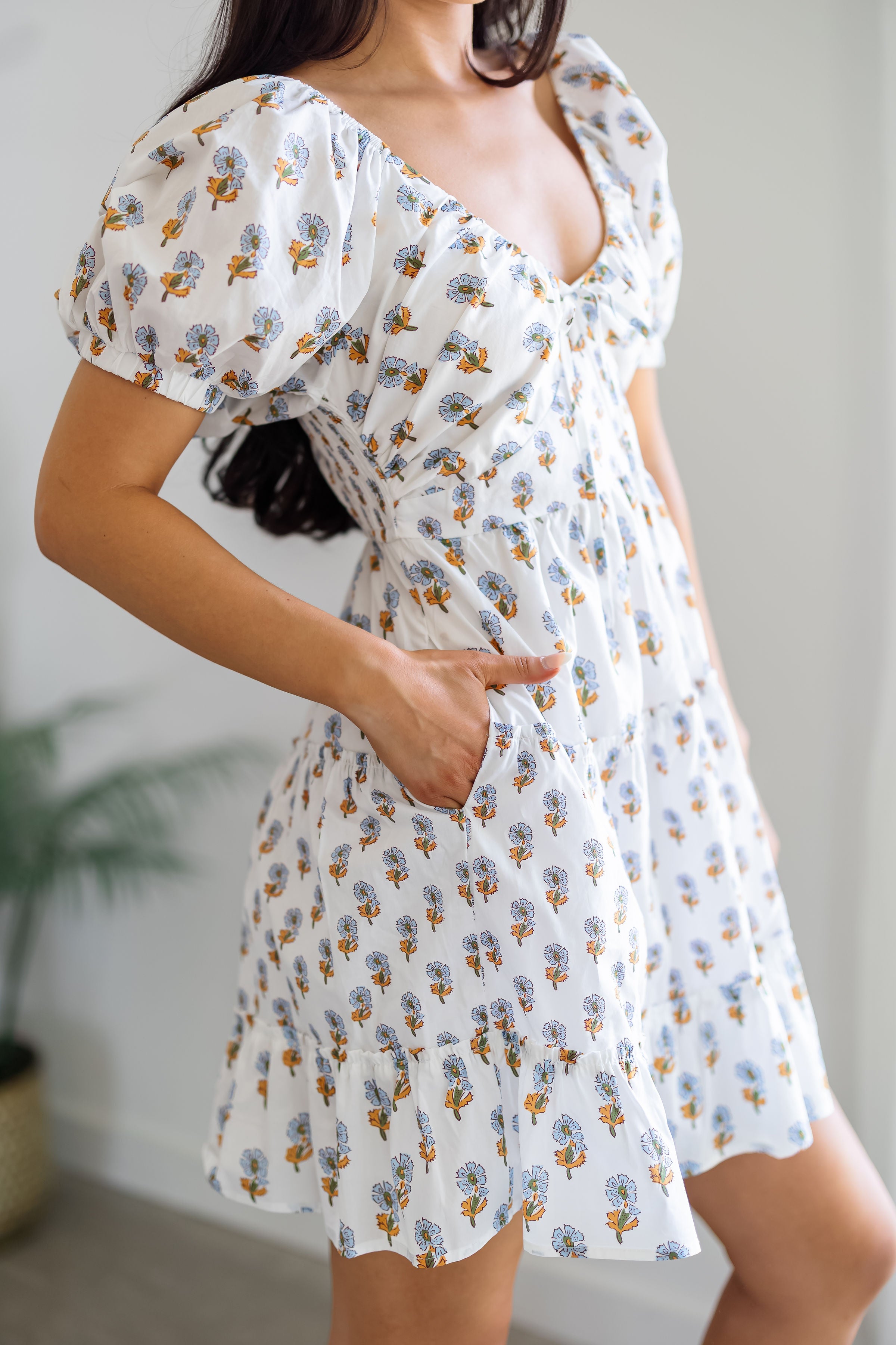 Twirl around in the "Meredith Dress!" Effortlessly feminine and perfect for the summer, this dress has so much charm to offer! Boasting a white base with blue and yellow floral prints throughout, along with a flattering v-neckline. The puffed sleeves give a flirty and carefree level to the look! To style, pair with boots for an elevated occasion, or with sandals to keep it casual!