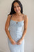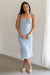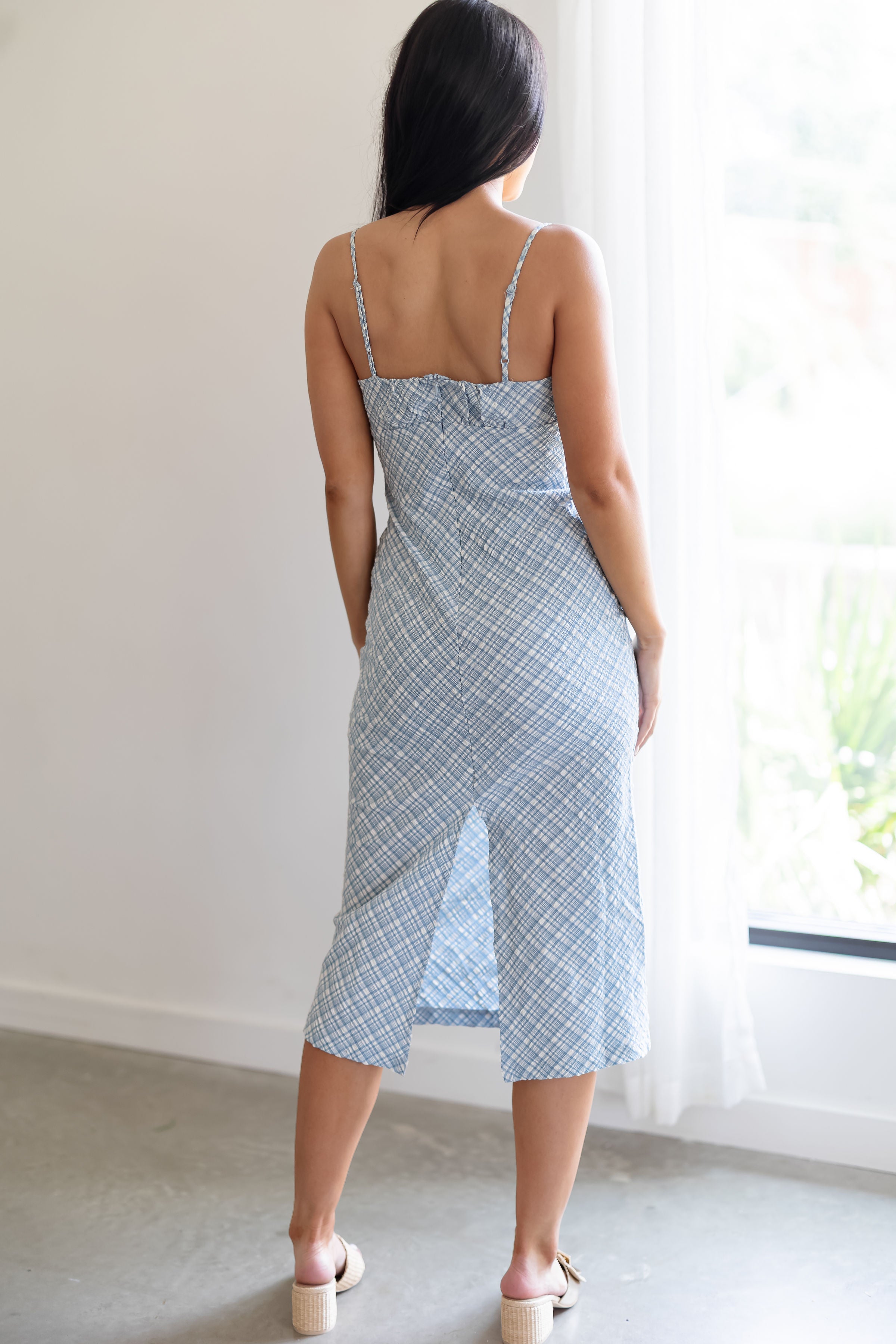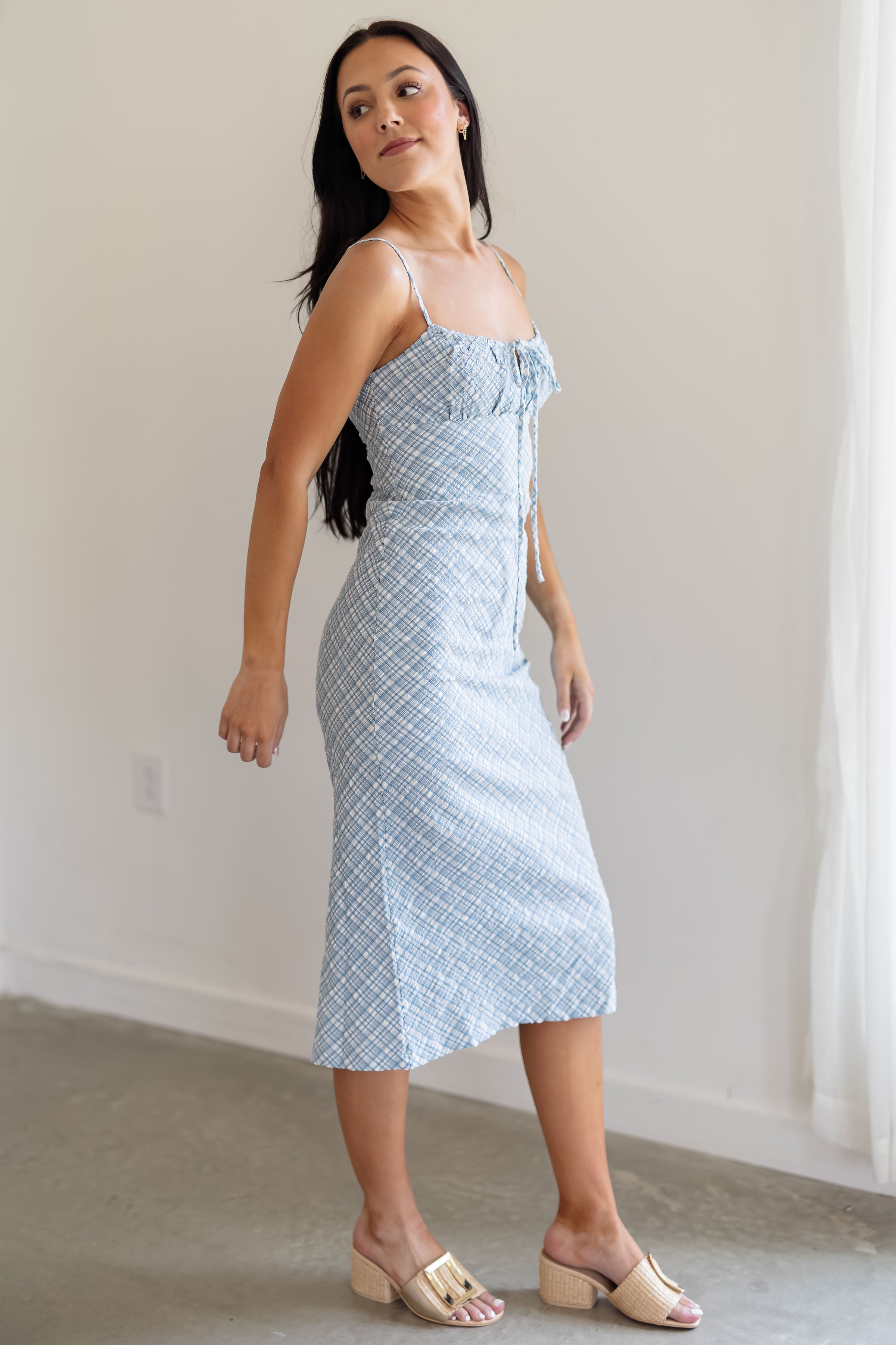 Prepare to charm in the "Naya Dress!" The perfect way to elevate your style, this midi dress offers style that can't be beat! Featuring a blue and white print, sweetheart neckline with tie, and slightly fitted skirt, this dress could easily be dressed up or down depending on your occasion. Pair it with heels to dress it up, or keep it causal with sandals!