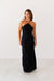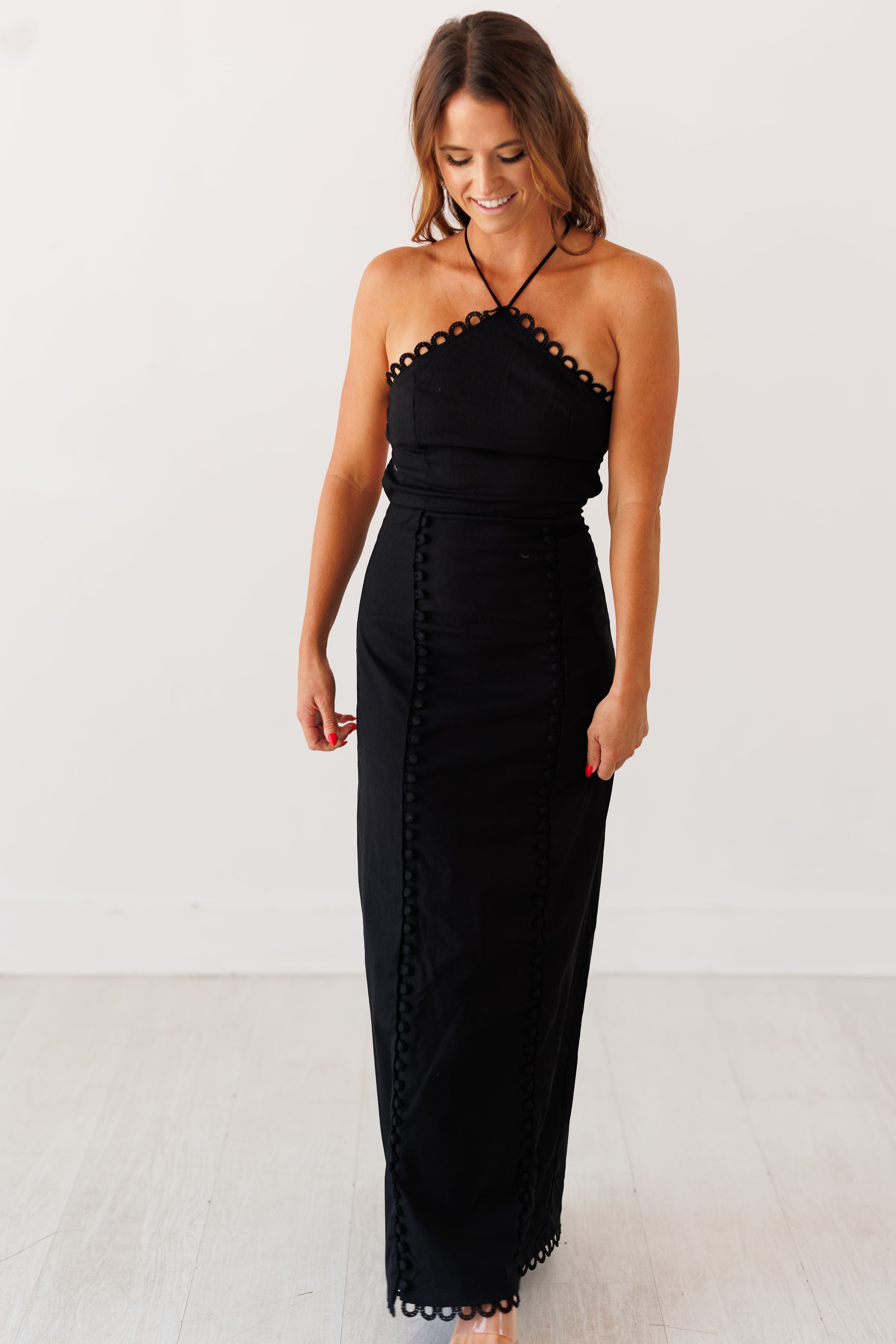 Turn heads in the "Rochelle Dress!" Elevated and chic are two words that we would use to describe this black maxi dress! This halter style dress has the most elevated details that would make this dress perfect for a black tie wedding or date night! Adorned with beaded trim along the neckline, as well as a lace up backless design and hidden side zipper, this dress is effortlessly stunning. The skirt is fully customizable with buttons going all the way up, allowing for one or two leg slits!