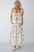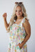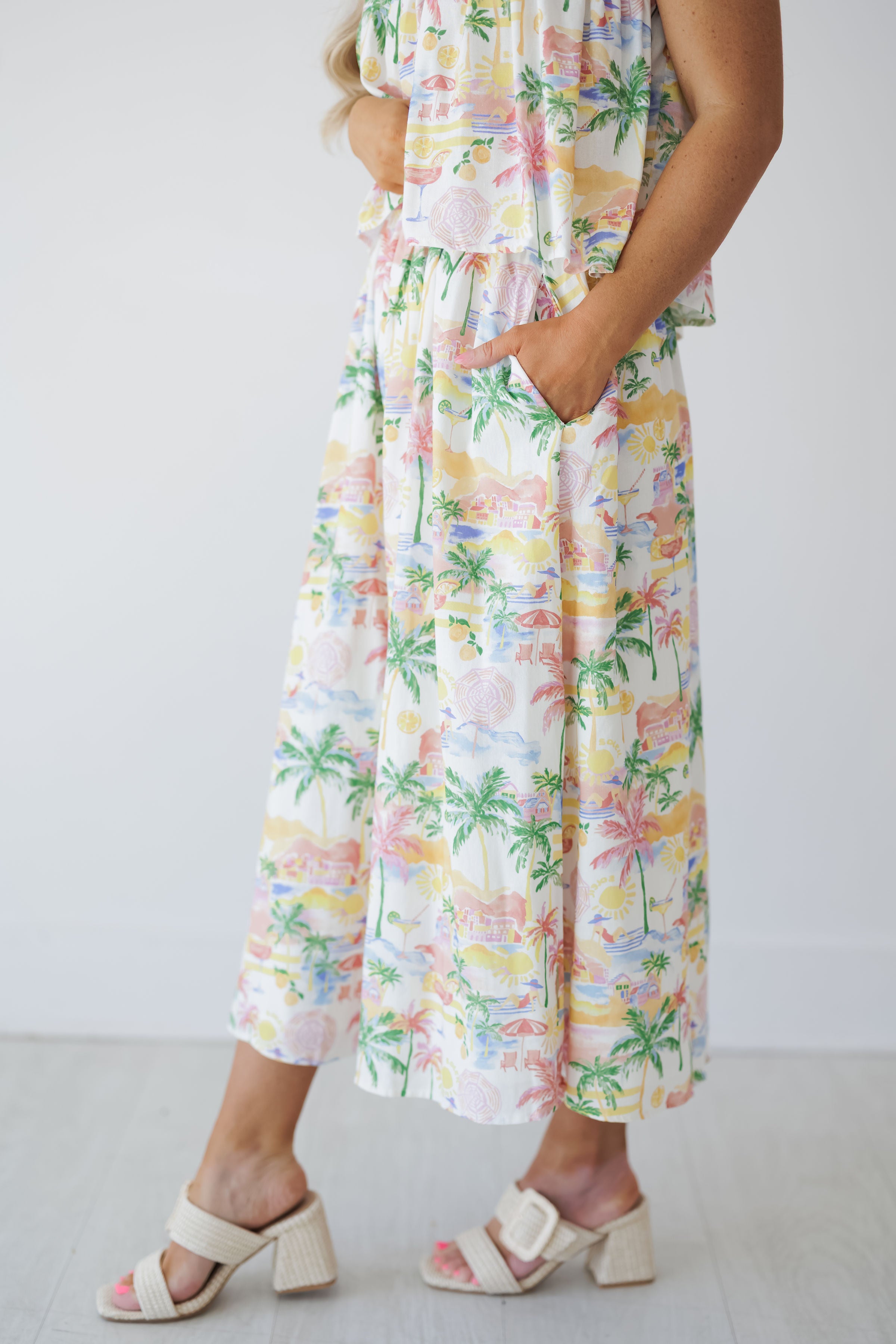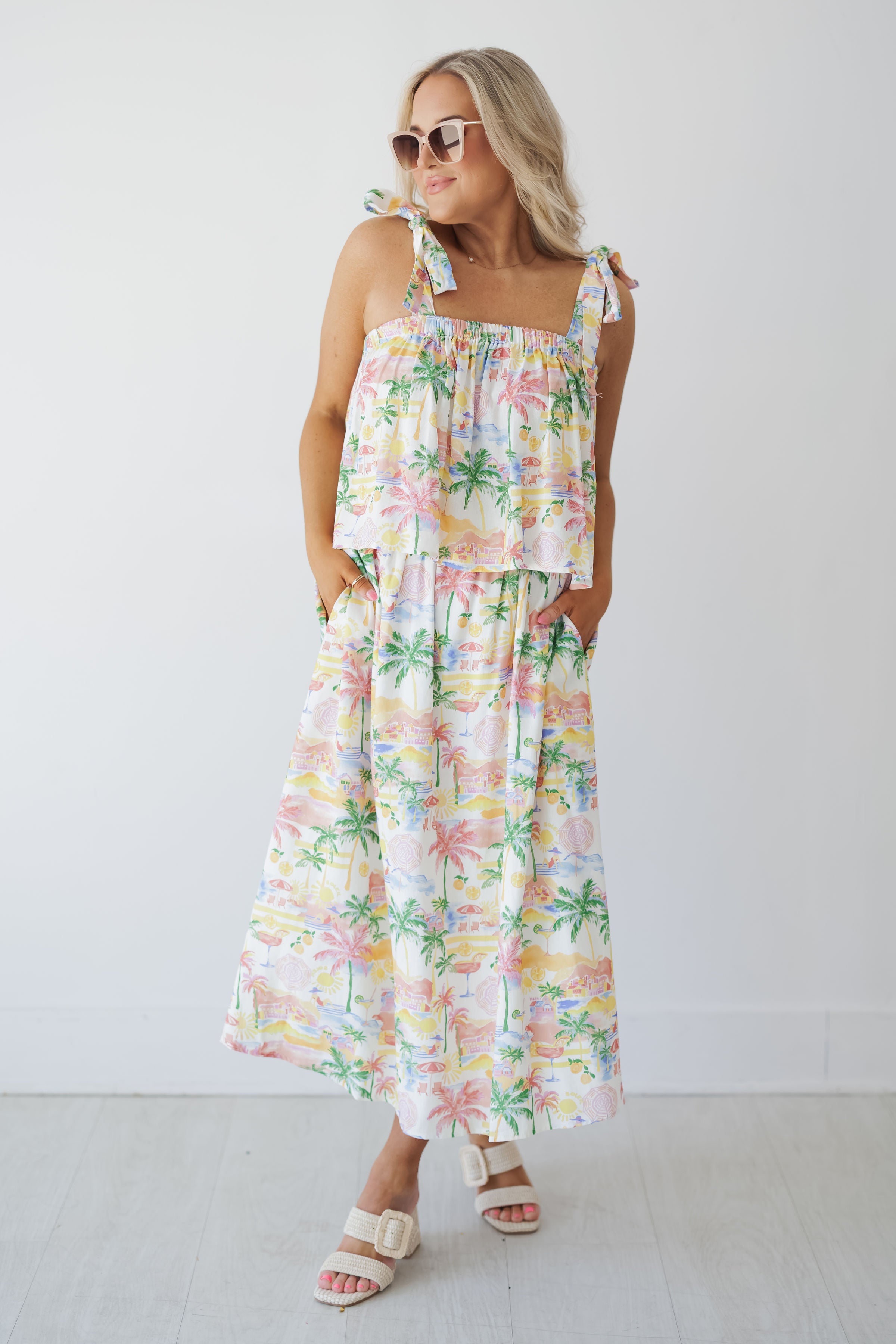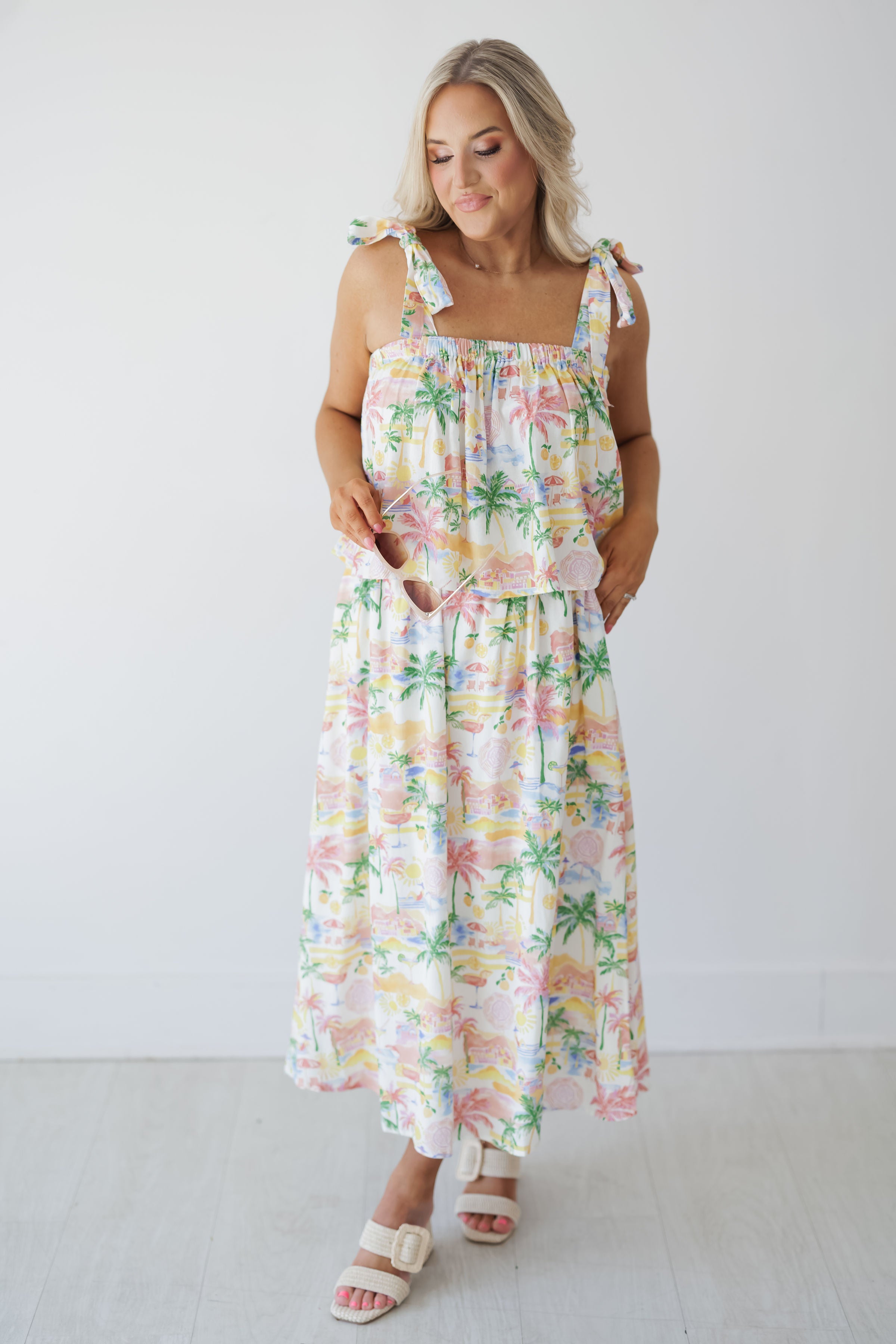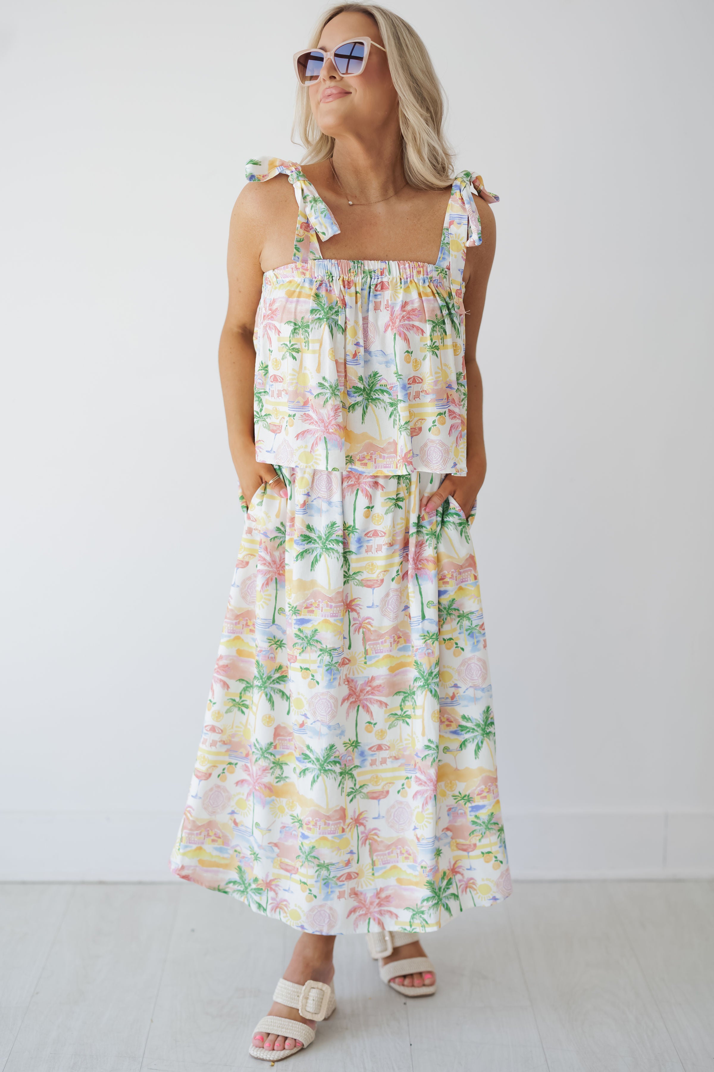 This whimsical two-piece set features a breezy crop top with charming tie straps and a tropical island print in soft pastel hues of pink, yellow, and green. The matching midi skirt offers a relaxed, flowing silhouette with convenient side pockets and an elastic waistband for all-day comfort. Crafted from lightweight fabric, this coordinated ensemble evokes carefree vacation vibes with its playful palm tree and beach scene motifs. Perfect for warm weather getaways or summer outings, this versatile set can be styled together for a complete look or mixed with other pieces in your wardrobe!