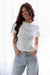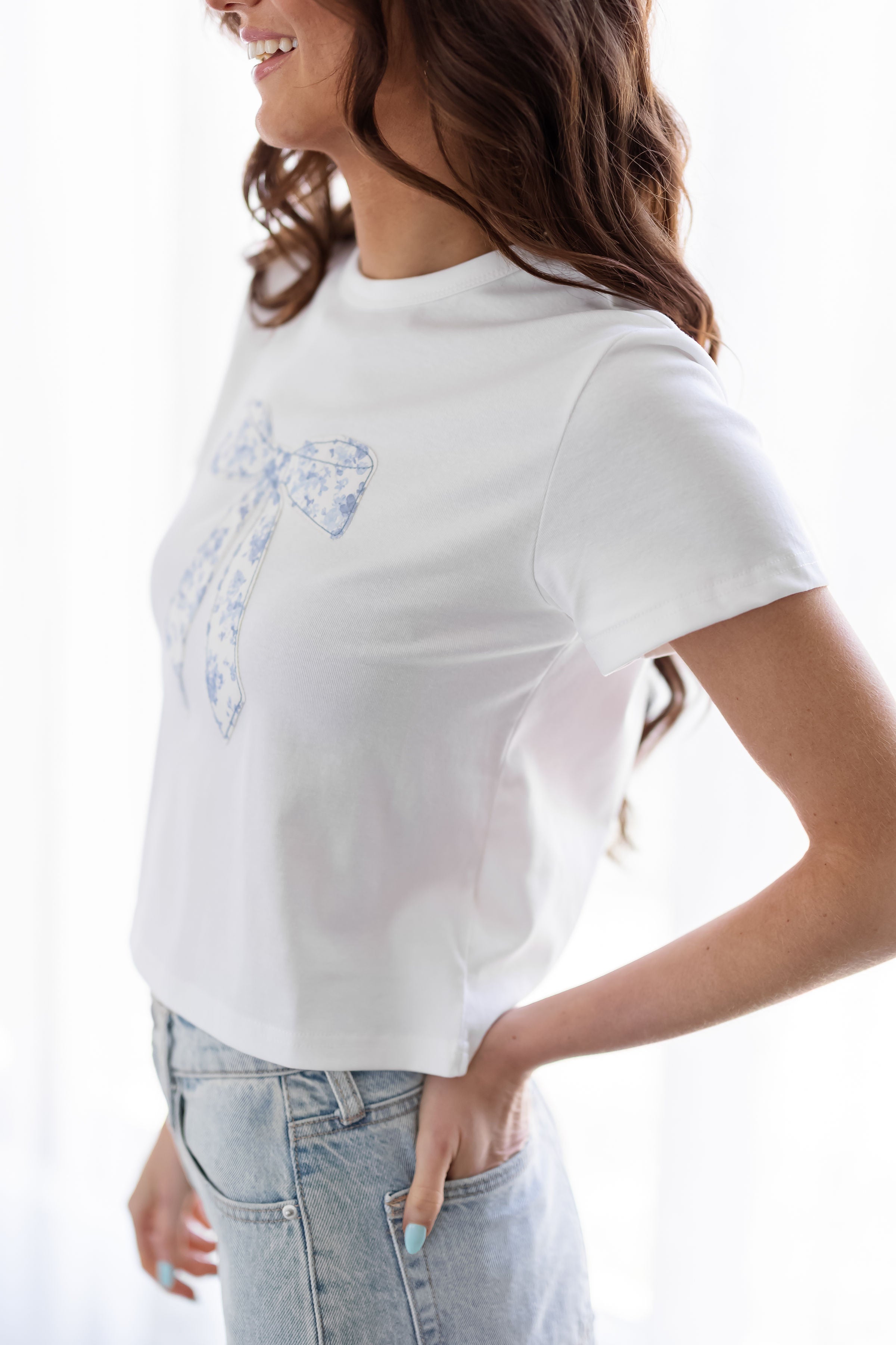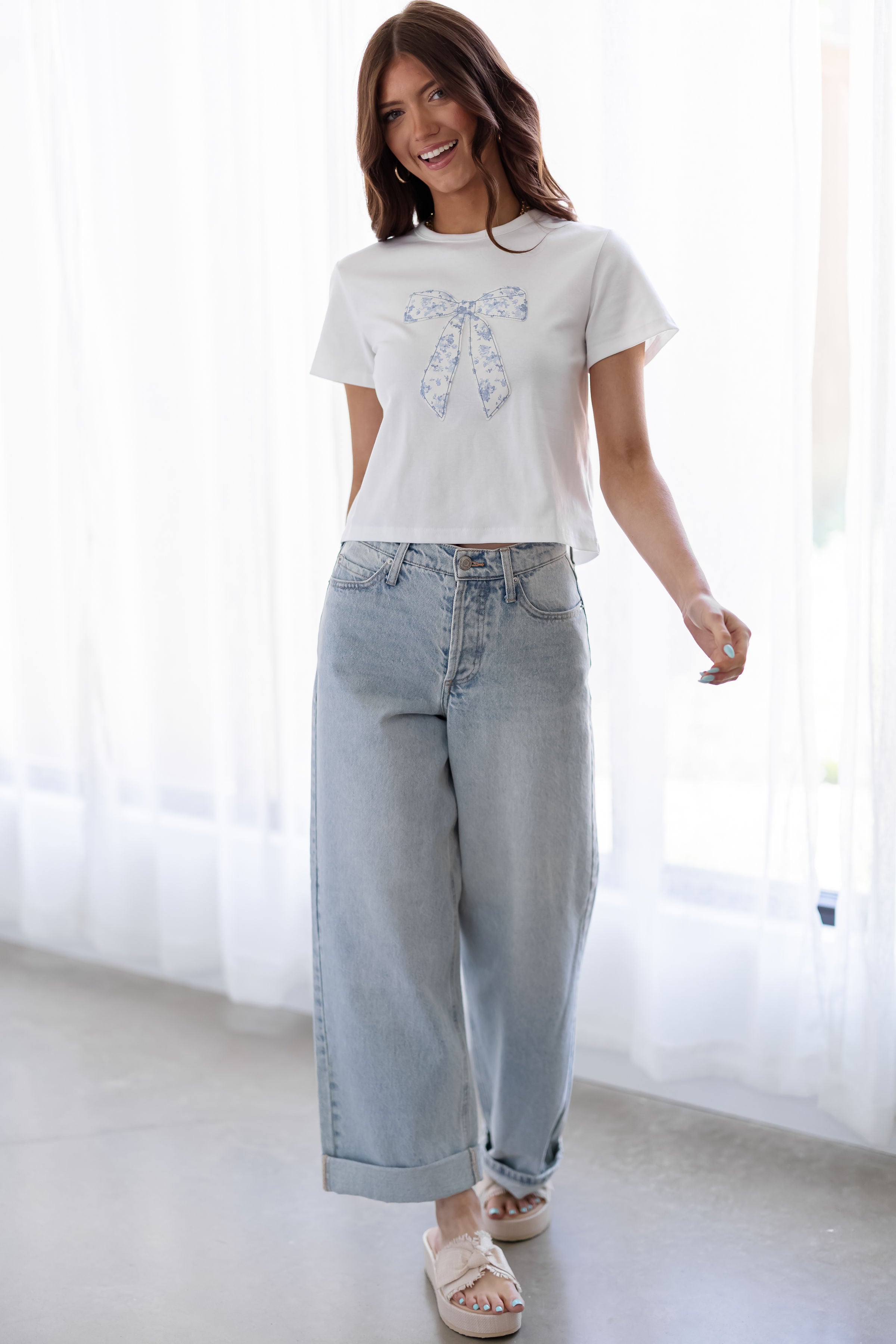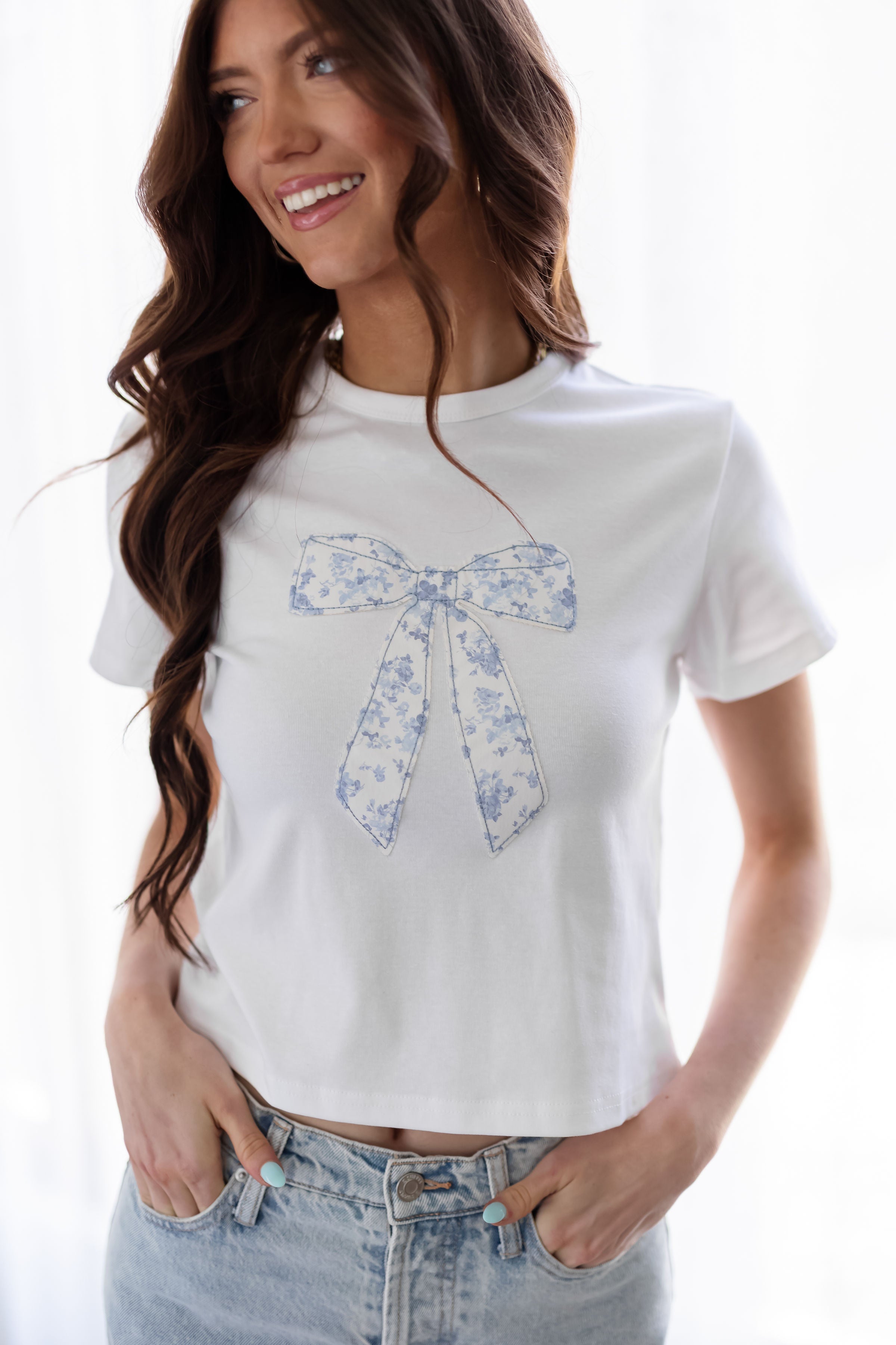 Stay chic in the "Wrapped With Love Top!" This white top is so simplistic yet elevated for the summertime! It features a slightly cropped length and a soft white fabric. The stitched on blue bow adds the perfect vintage inspired touch! This top pairs perfectly with any denim bottoms or lounge shorts!